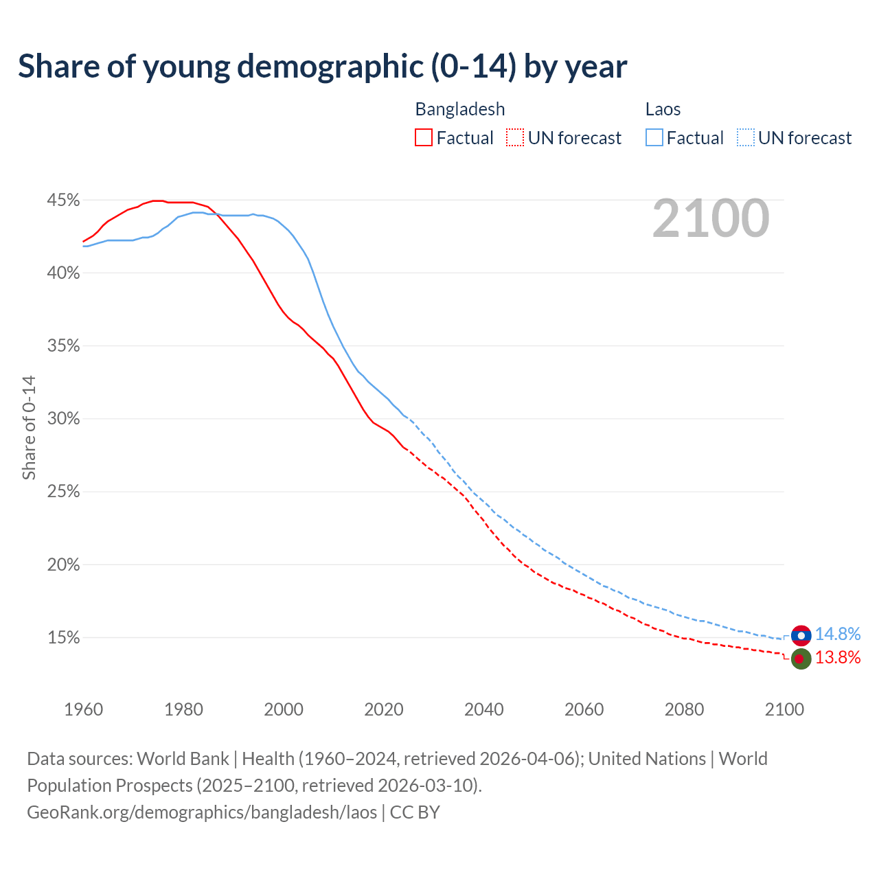 - The share of young demographic (0-15 years old) in Bangladesh is 28% vs 30.2% in Laos.