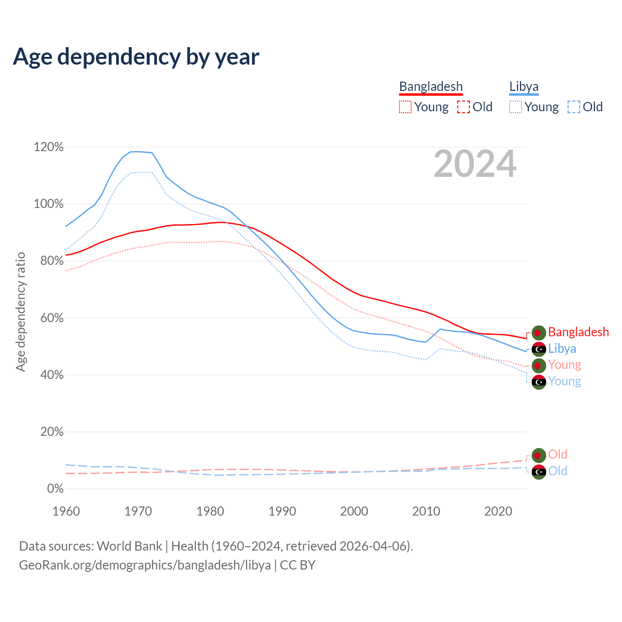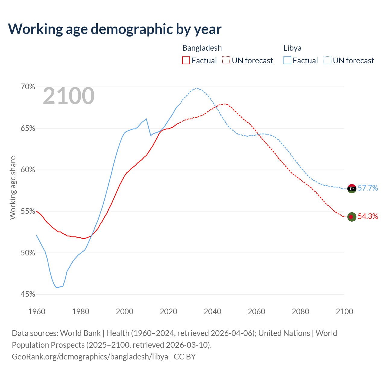 The share of older people aged 65 and over is 6.5% in Bangladesh and 5.02% in Libya. Life expectancy in Bangladesh compared to Libya .