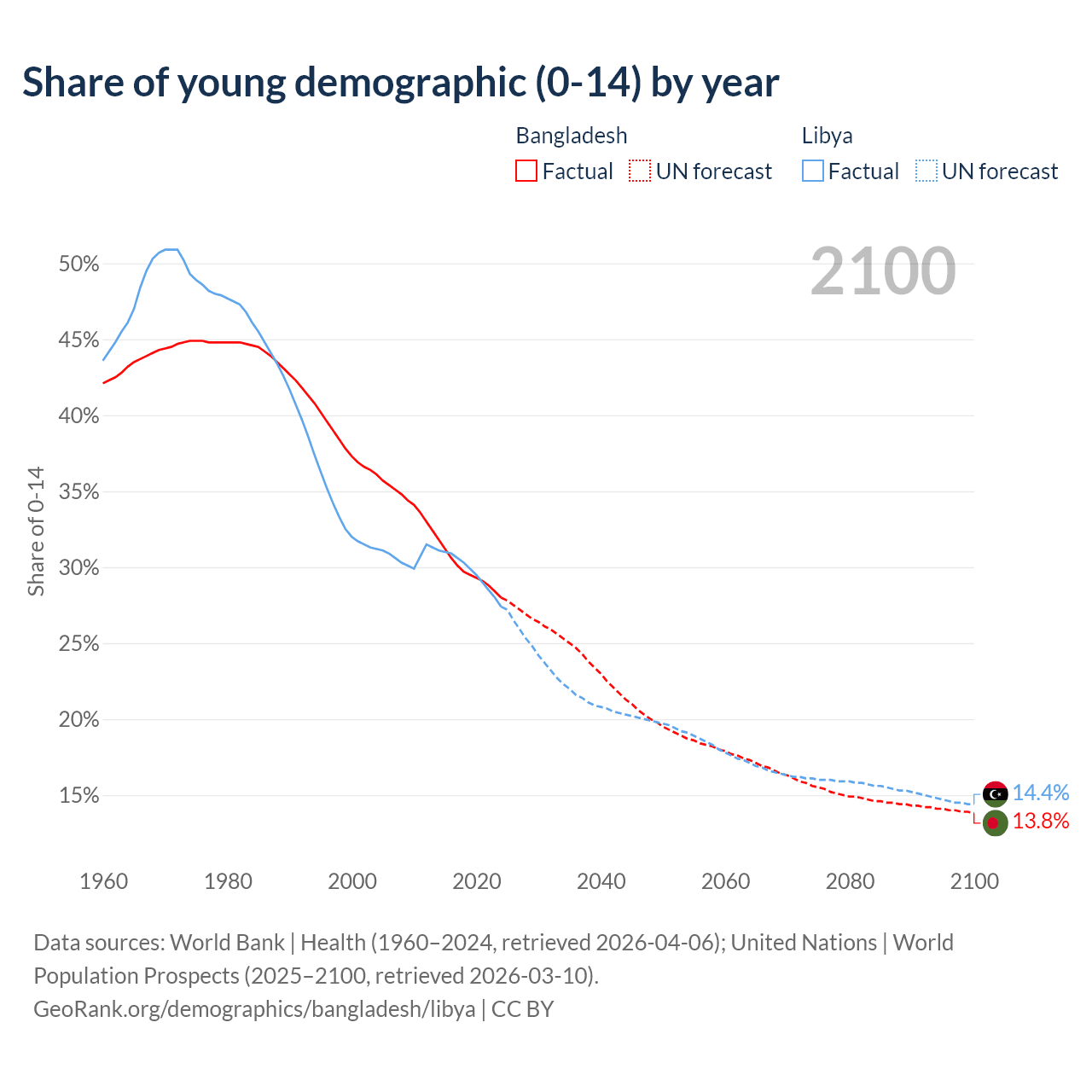 - The share of young demographic (0-15 years old) in Bangladesh is 28% vs 27.4% in Libya.