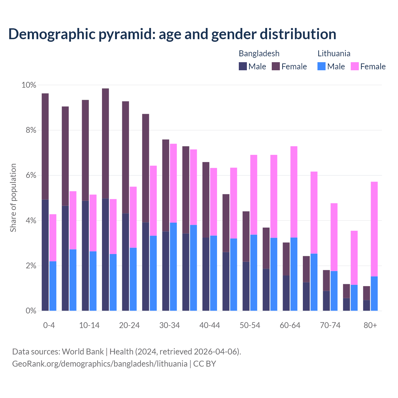 - Bangladesh is ranked 124/196 by median age (oldest to youngest) vs 28/196 for Lithuania.