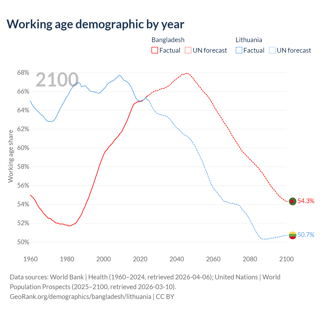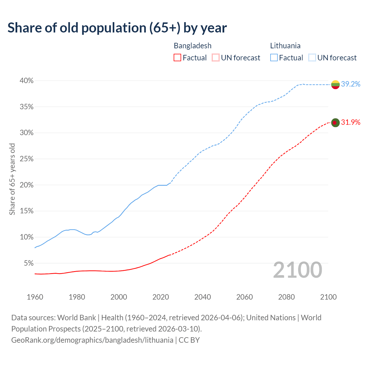 The share of older people aged 65 and over is 6.5% in Bangladesh and 20.2% in Lithuania. Life expectancy in Bangladesh compared to Lithuania .