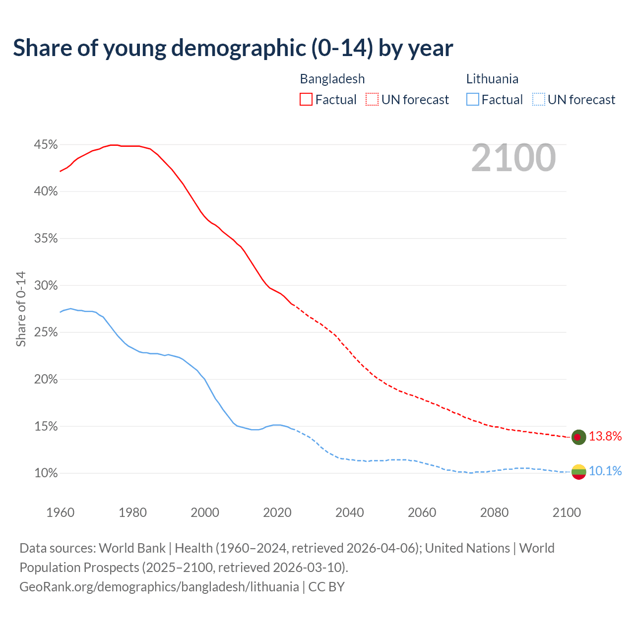 - The share of young demographic (0-15 years old) in Bangladesh is 28% vs 14.7% in Lithuania.