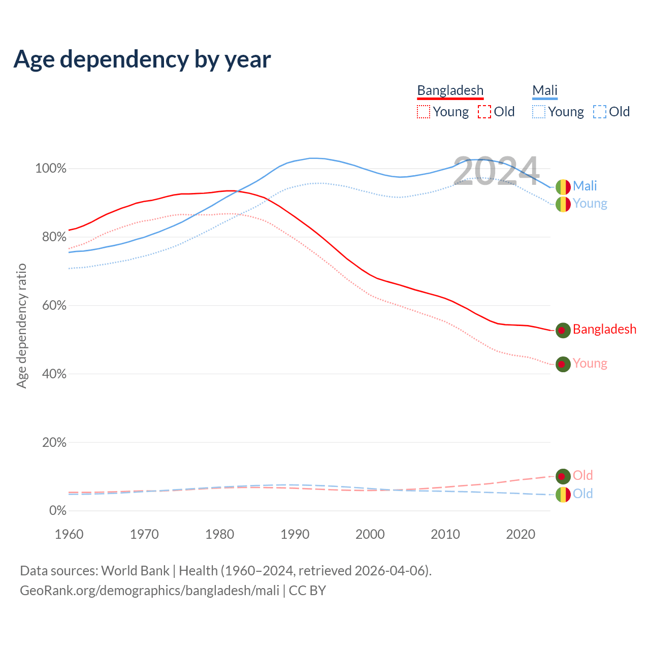 - Bangladesh is ranked 124/196 by median age (oldest to youngest) vs 193/196 for Mali.