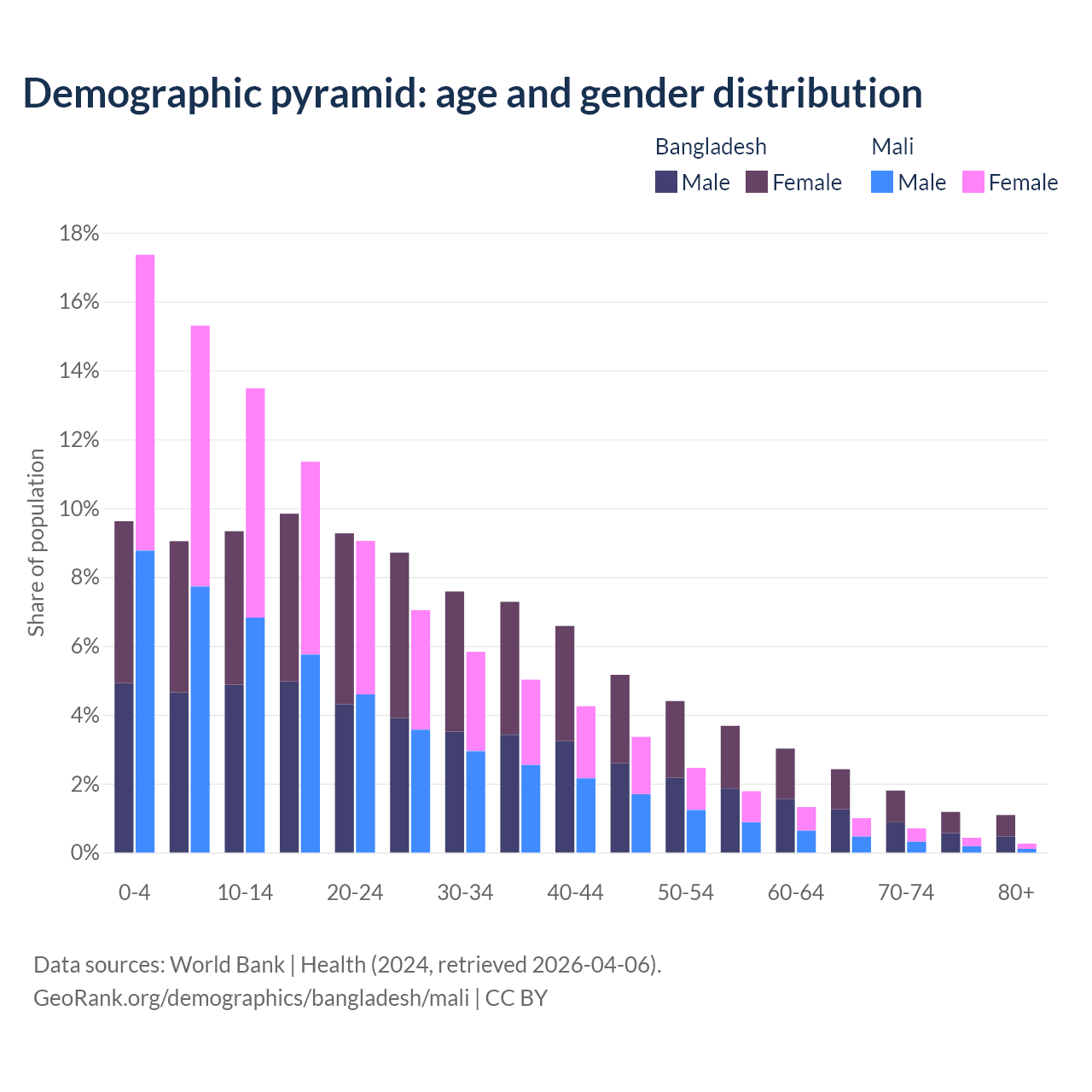 - As of 2026, the population of Bangladesh is 178M vs 26.1M in Mali - 6.82 times difference.