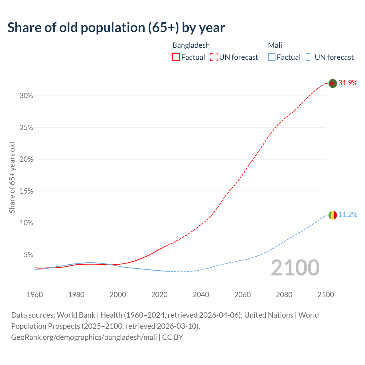 - The share of old-age demographic (65+) in Bangladesh is 6.5% vs 2.38% in Mali.