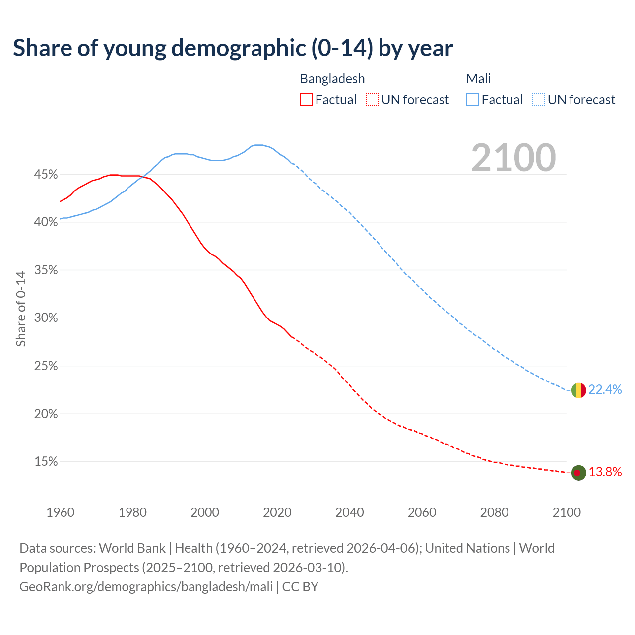 - The share of young demographic (0-15 years old) in Bangladesh is 28% vs 46.1% in Mali.