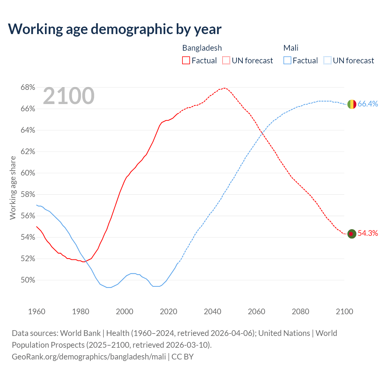 - Bangladesh has 117M working age adults (aged 15-64) vs 13.5M in Mali.