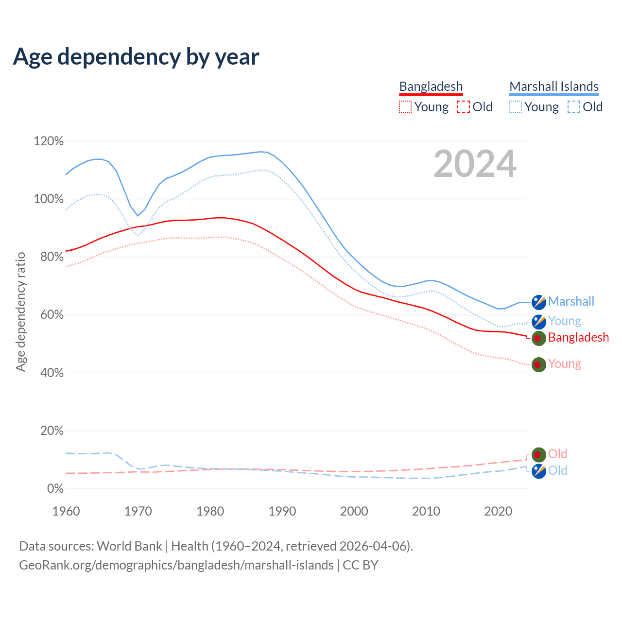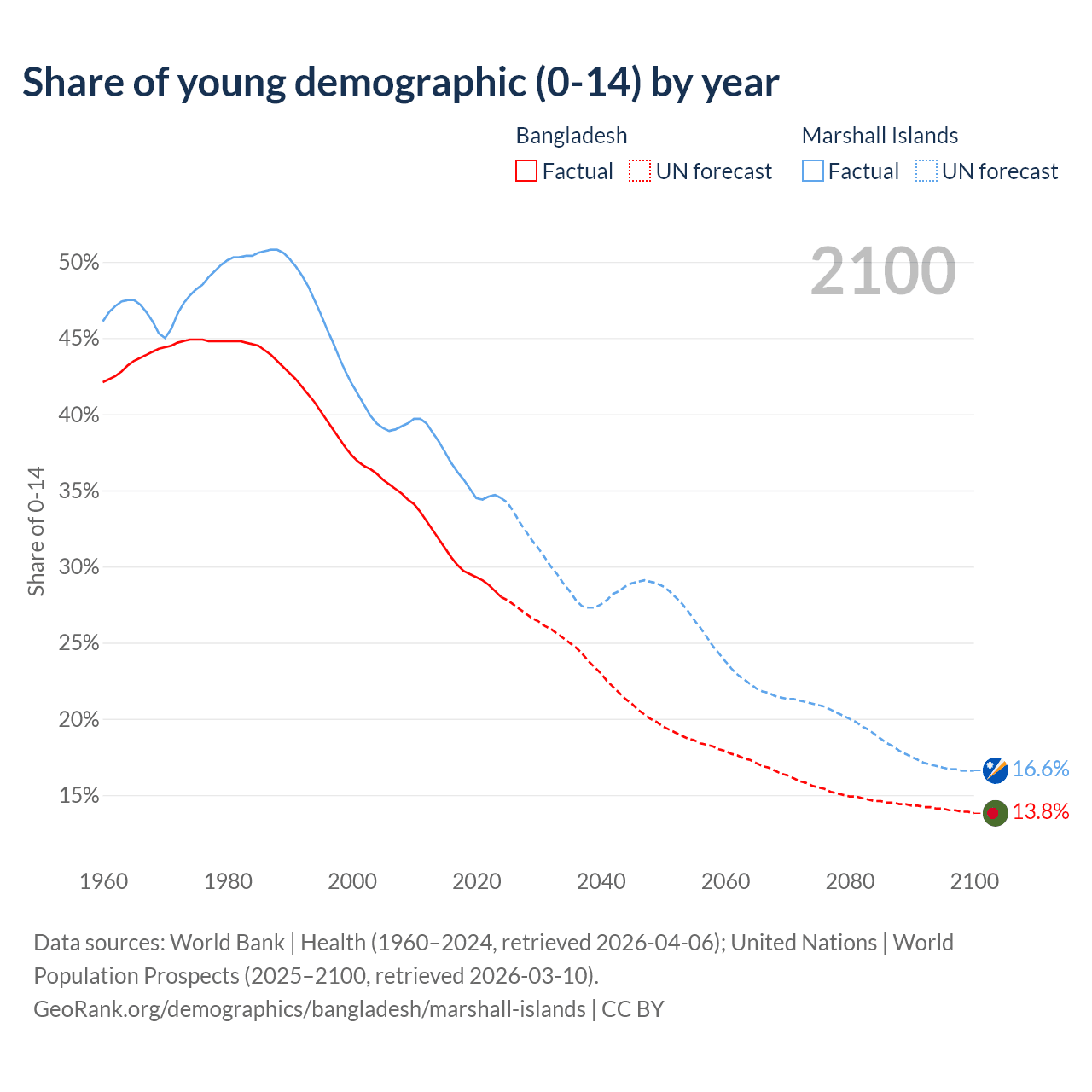 - The share of young demographic (0-15 years old) in Bangladesh is 28% vs 34.5% in the Marshall Islands.