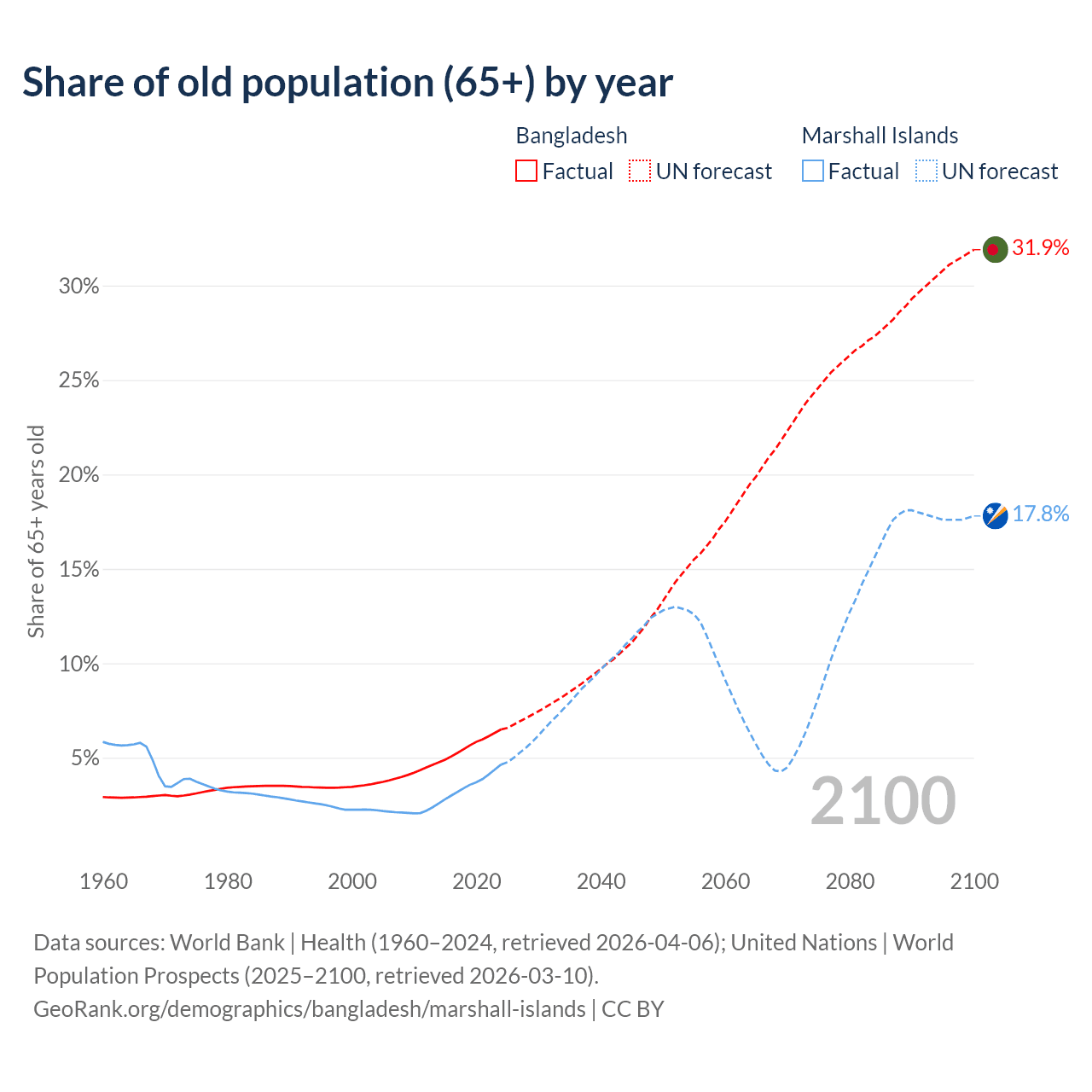 The share of older people aged 65 and over is 6.5% in Bangladesh and 4.64% in the Marshall Islands. Life expectancy in Bangladesh compared to the Marshall Islands .