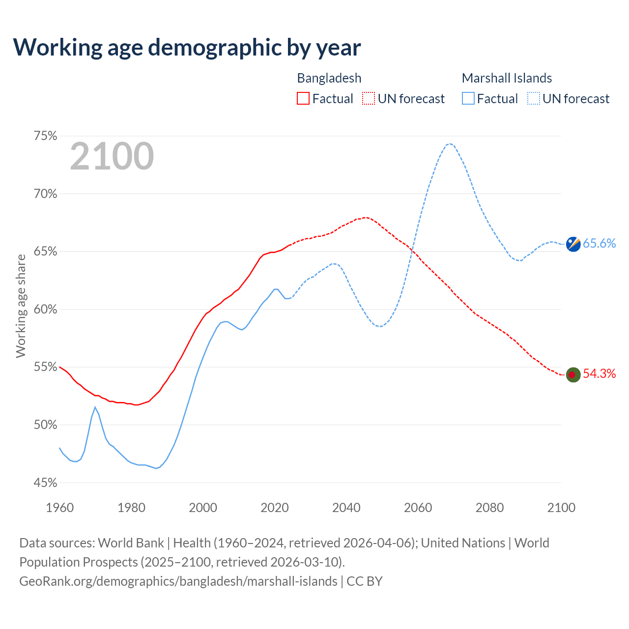 Median age Bangladesh vs Marshall Islands, 1960-2100