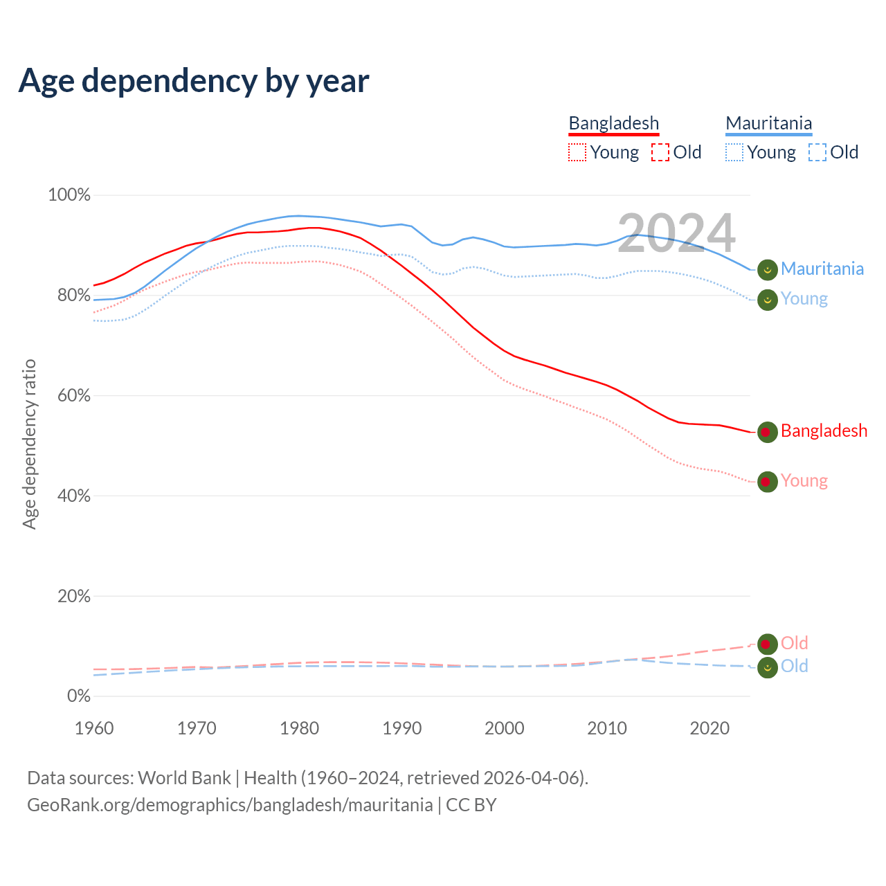 - Bangladesh is ranked 124/196 by median age (oldest to youngest) vs 185/196 for Mauritania.