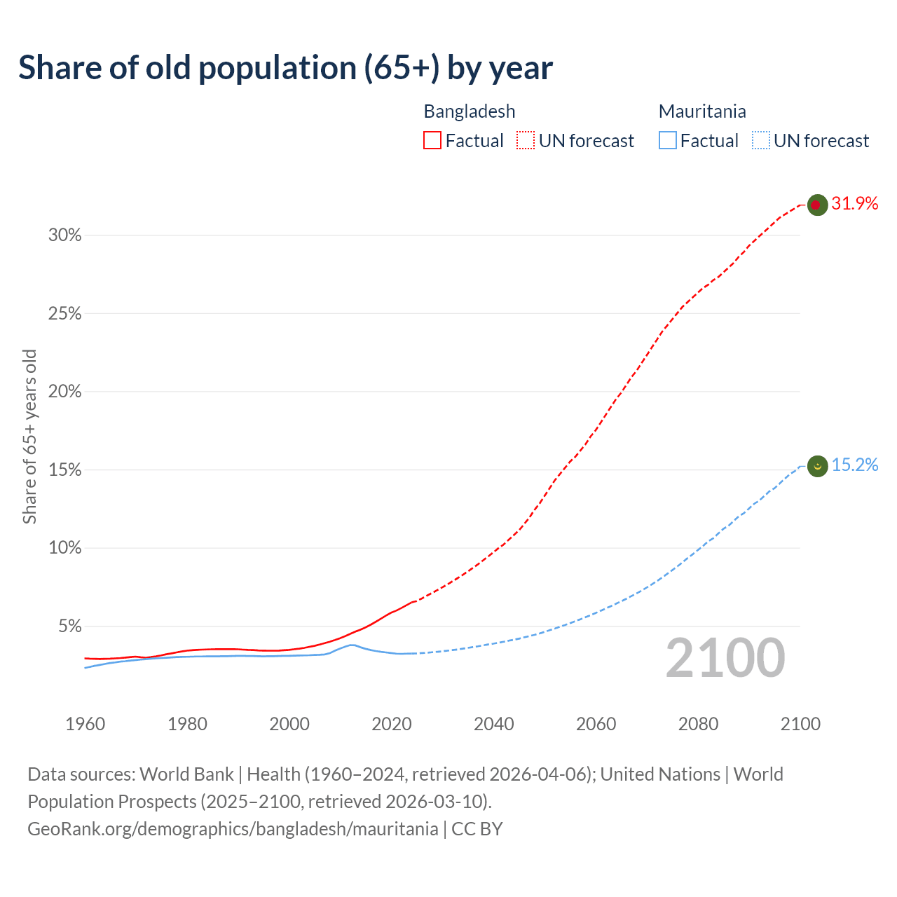 - The share of old-age demographic (65+) in Bangladesh is 6.5% vs 3.23% in Mauritania.