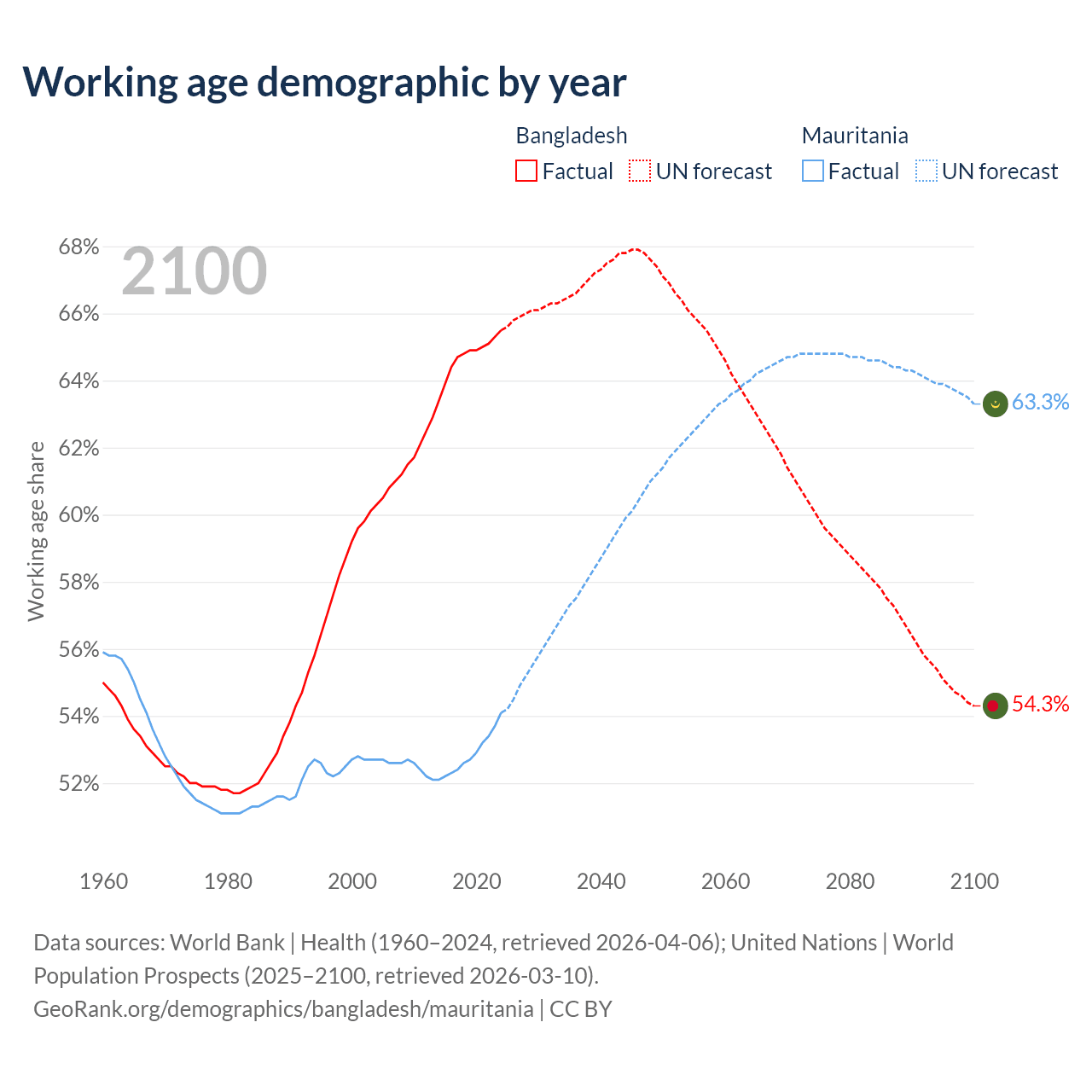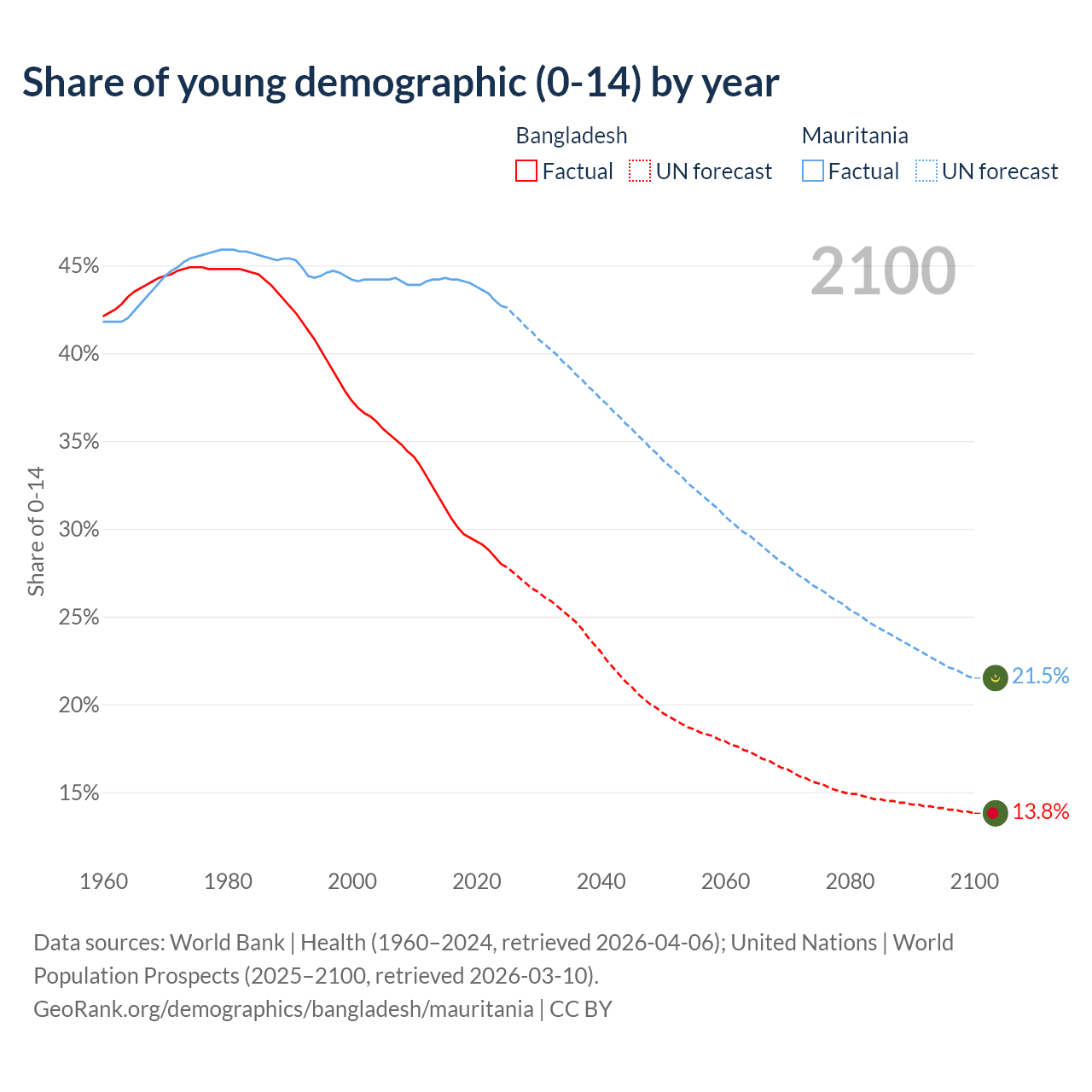 - The share of young demographic (0-15 years old) in Bangladesh is 28% vs 42.7% in Mauritania.