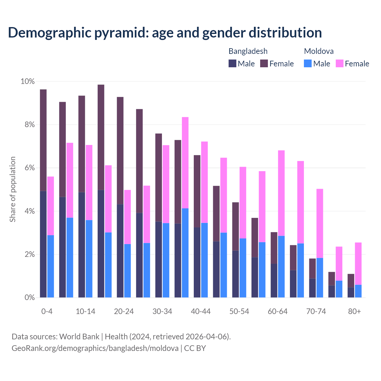 - Bangladesh is ranked 124/196 by median age (oldest to youngest) vs 54/196 for Moldova.
