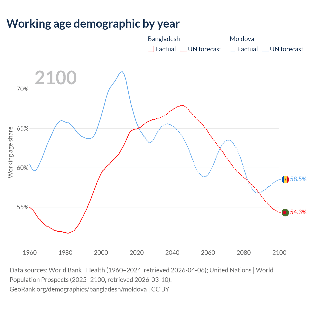 The share of older people aged 65 and over is 6.5% in Bangladesh and 16.2% in Moldova. Life expectancy in Bangladesh compared to Moldova .