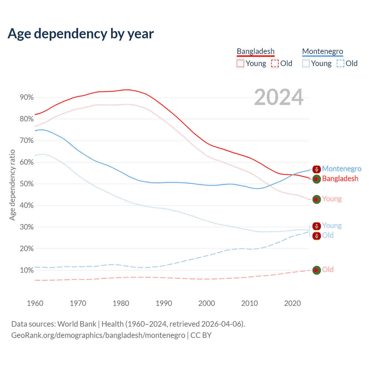 - Bangladesh is ranked 124/196 by median age (oldest to youngest) vs 45/196 for Montenegro.