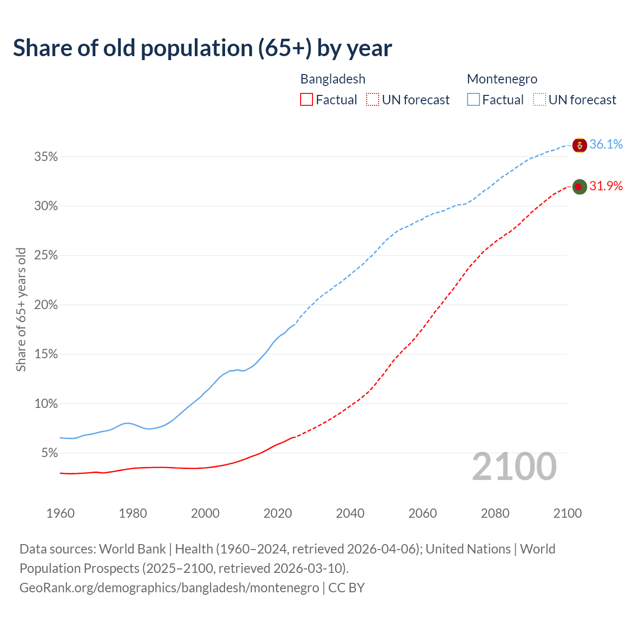 The share of older people aged 65 and over is 6.5% in Bangladesh and 17.8% in Montenegro. Life expectancy in Bangladesh compared to Montenegro .