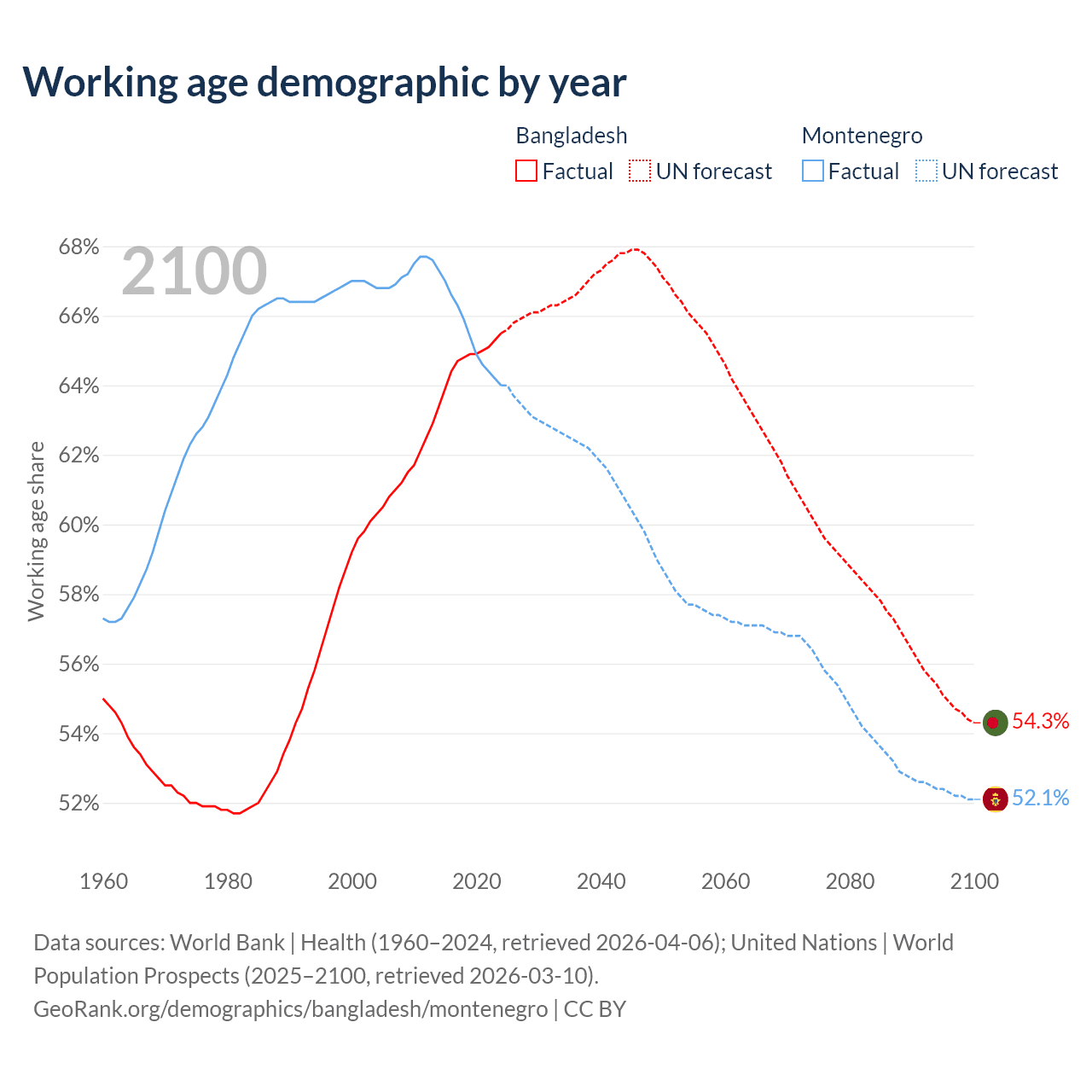 Median age Bangladesh vs Montenegro, 1960-2100