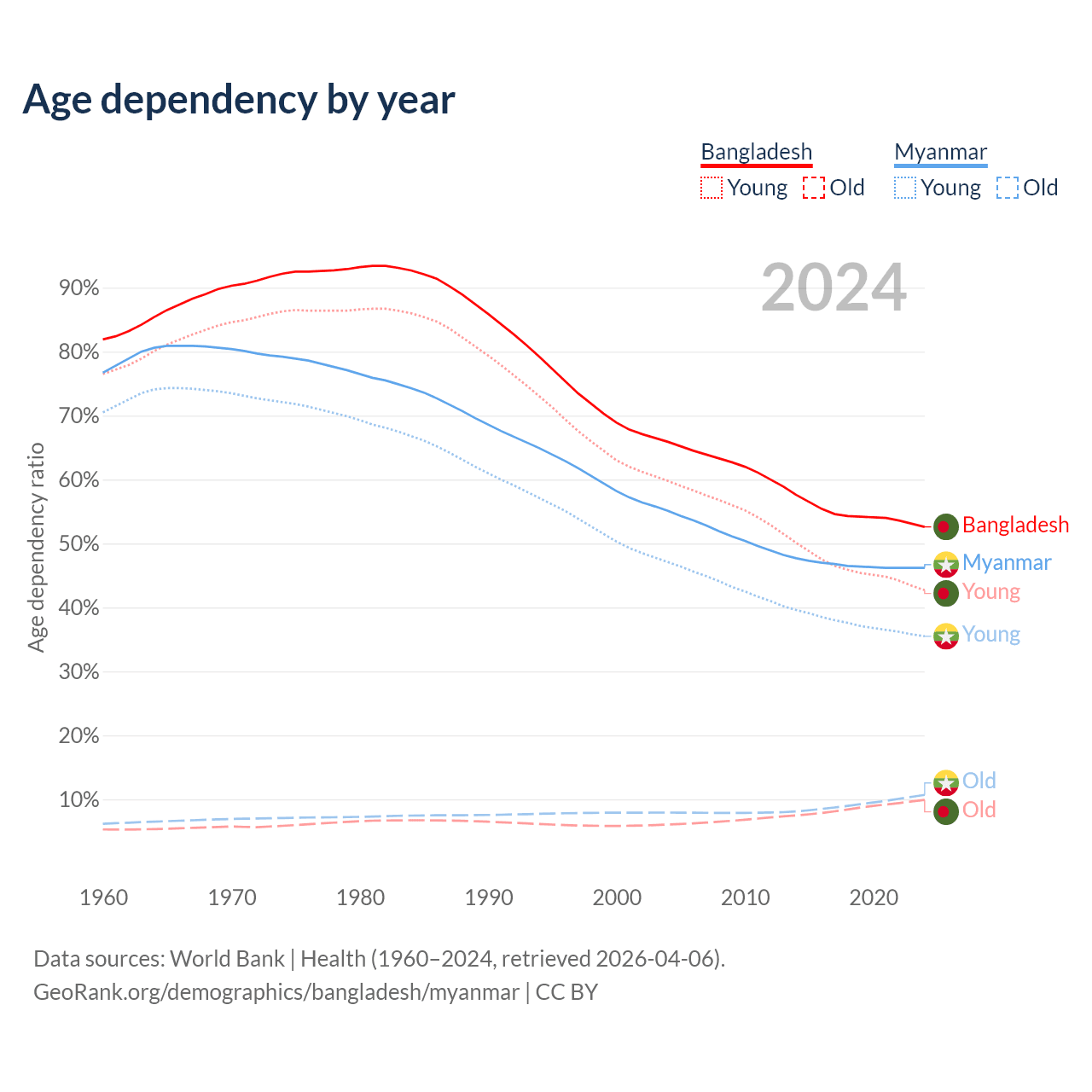 - Bangladesh is ranked 124/196 by median age (oldest to youngest) vs 96/196 for Myanmar.