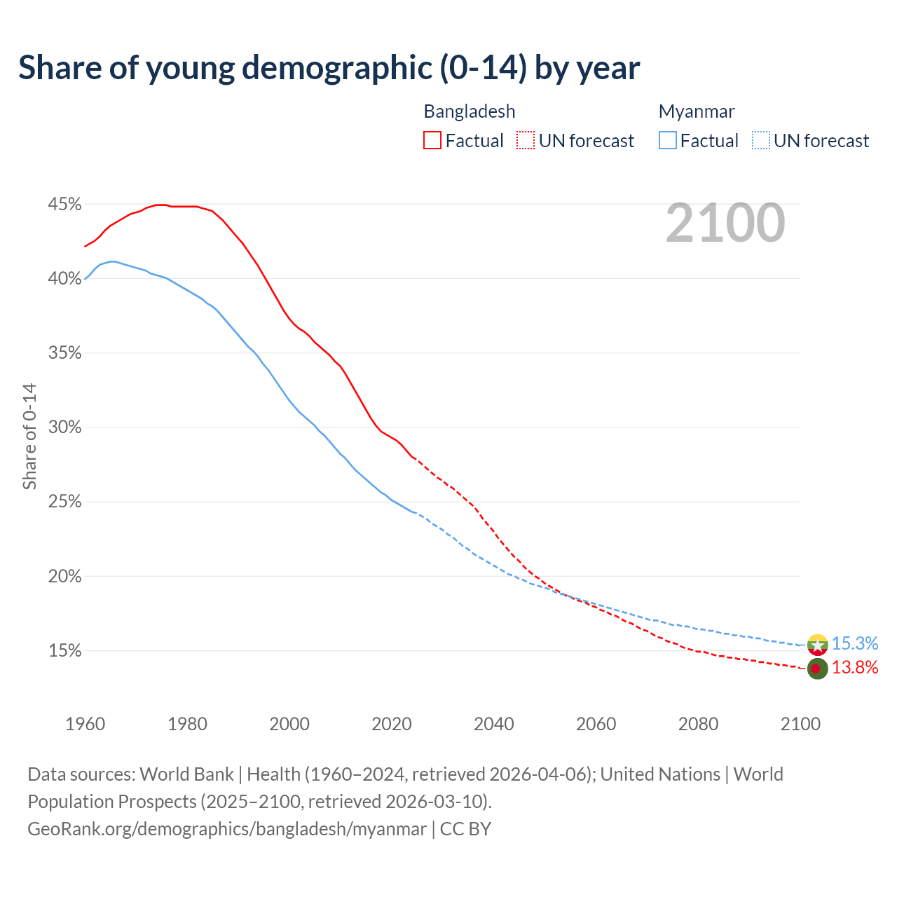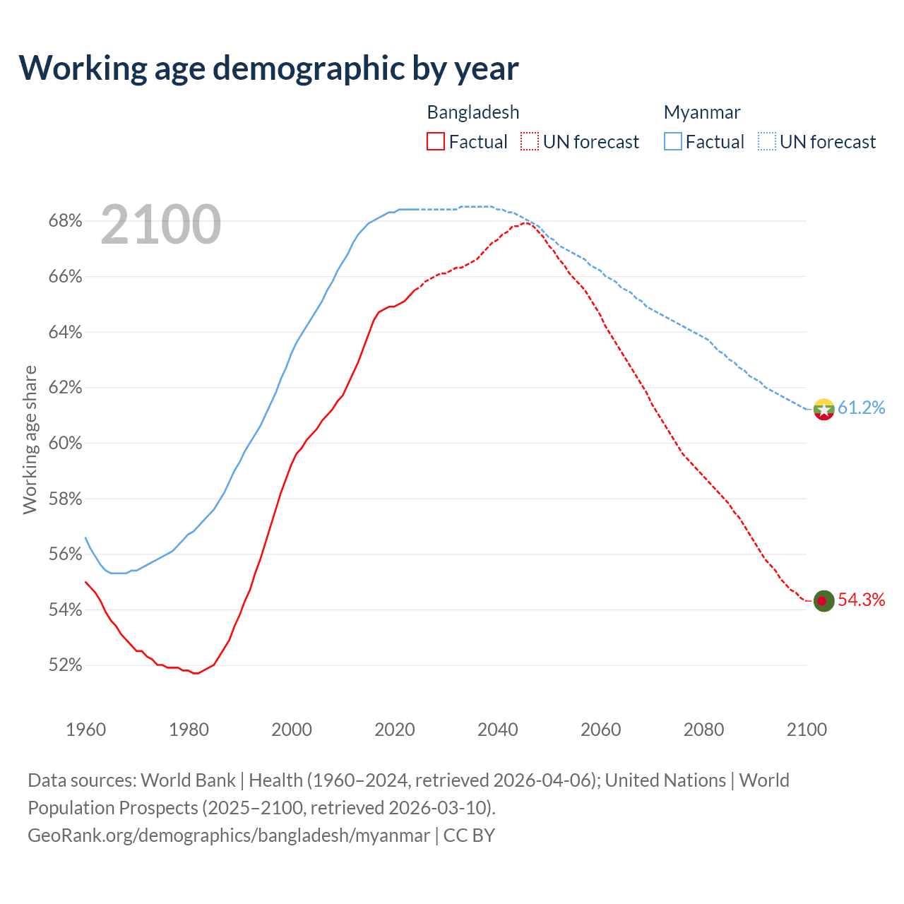 Median age Bangladesh vs Myanmar, 1960-2100