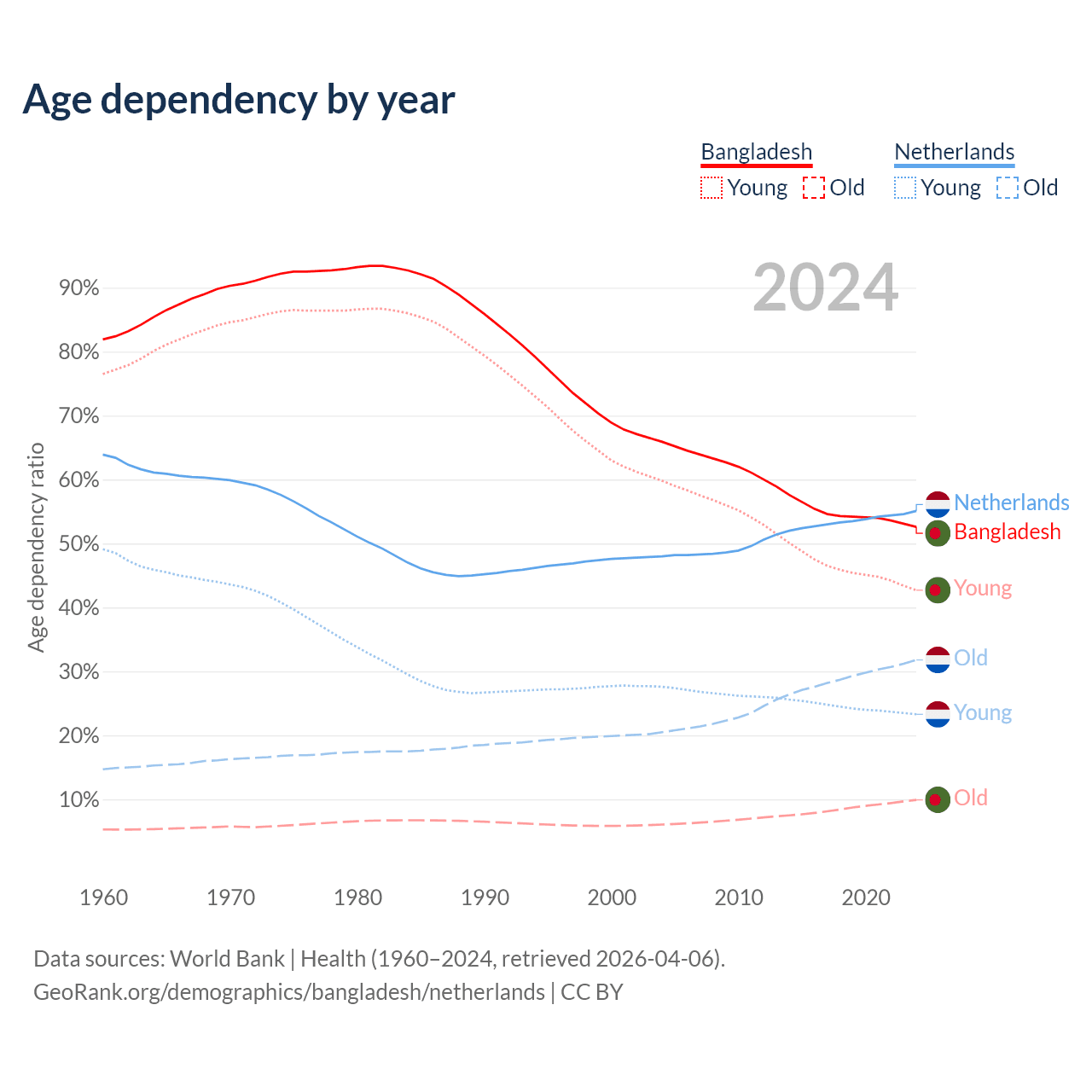 - The share of old-age demographic (65+) in Bangladesh is 6.5% vs 20.5% in the Netherlands.