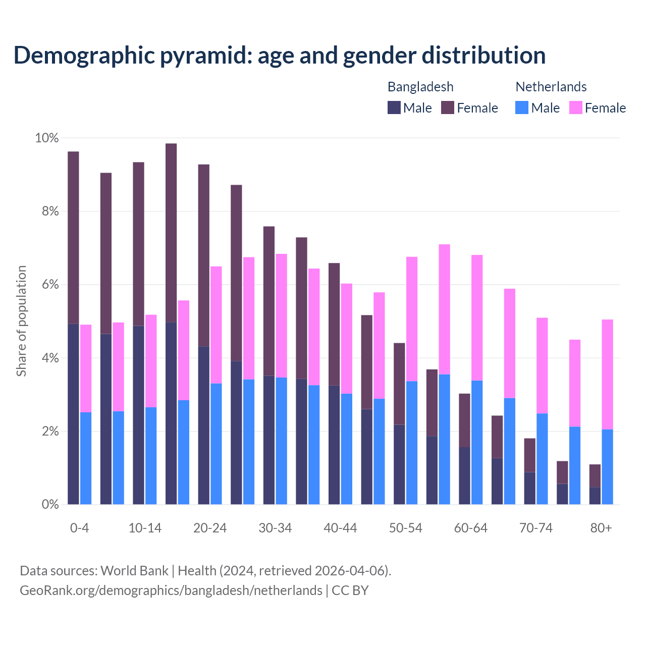 - The median age in Bangladesh is 26.7 years compared to 42.4 years in the Netherlands.