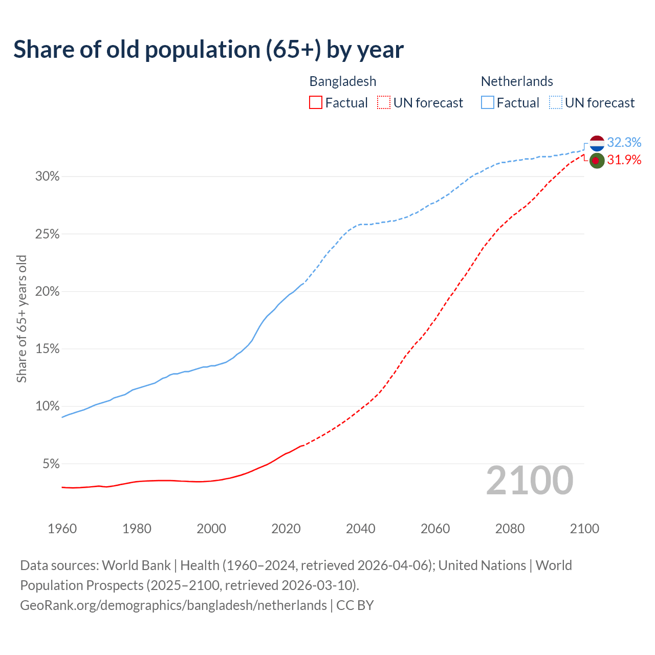 The share of older people aged 65 and over is 6.5% in Bangladesh and 20.5% in the Netherlands. Life expectancy in Bangladesh compared to the Netherlands .