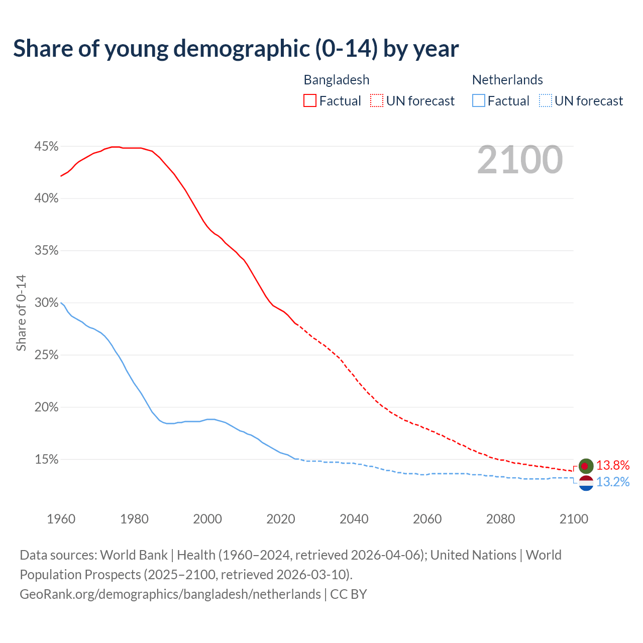 - The share of young demographic (0-15 years old) in Bangladesh is 28% vs 15% in the Netherlands.