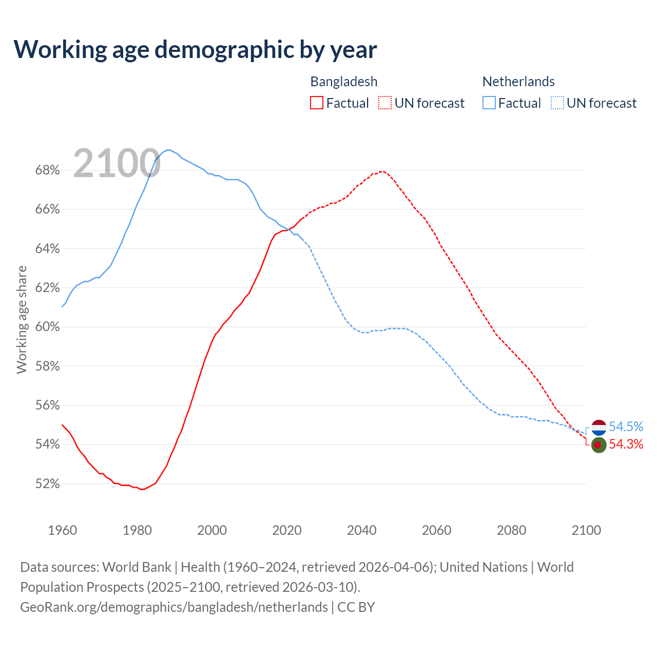 - Bangladesh has 117M working age adults (aged 15-64) vs 11.8M in the Netherlands.