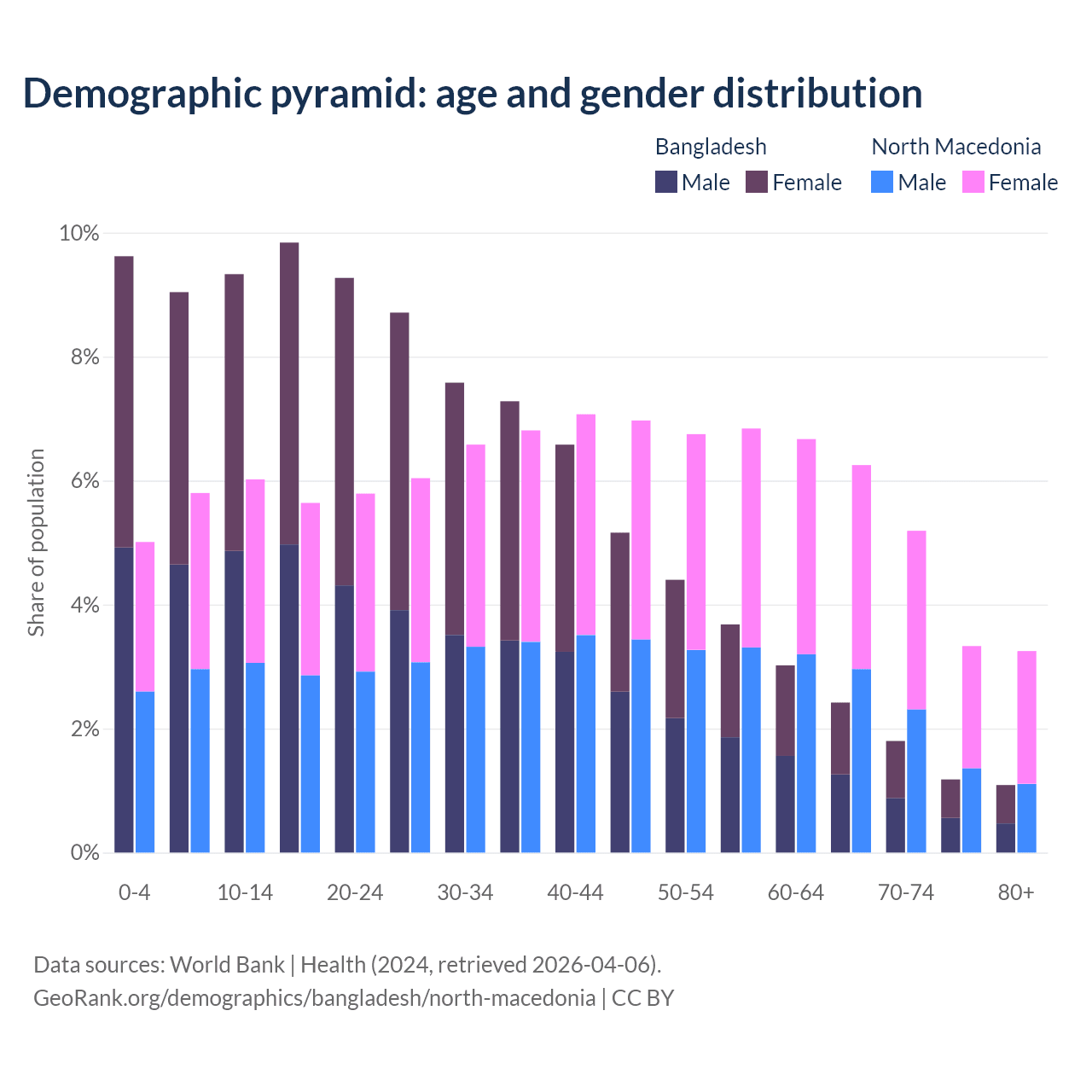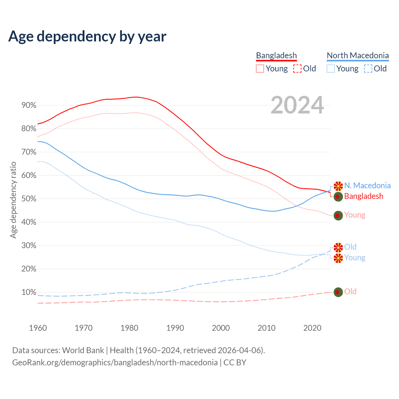 - Bangladesh is ranked 124/196 by median age (oldest to youngest) vs 37/196 for North Macedonia.