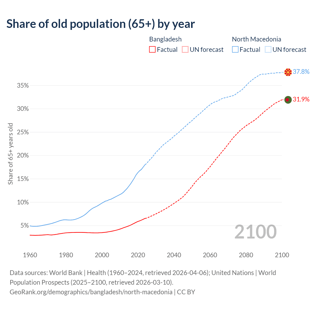 The share of older people aged 65 and over is 6.5% in Bangladesh and 18% in North Macedonia. Life expectancy in Bangladesh compared to North Macedonia .