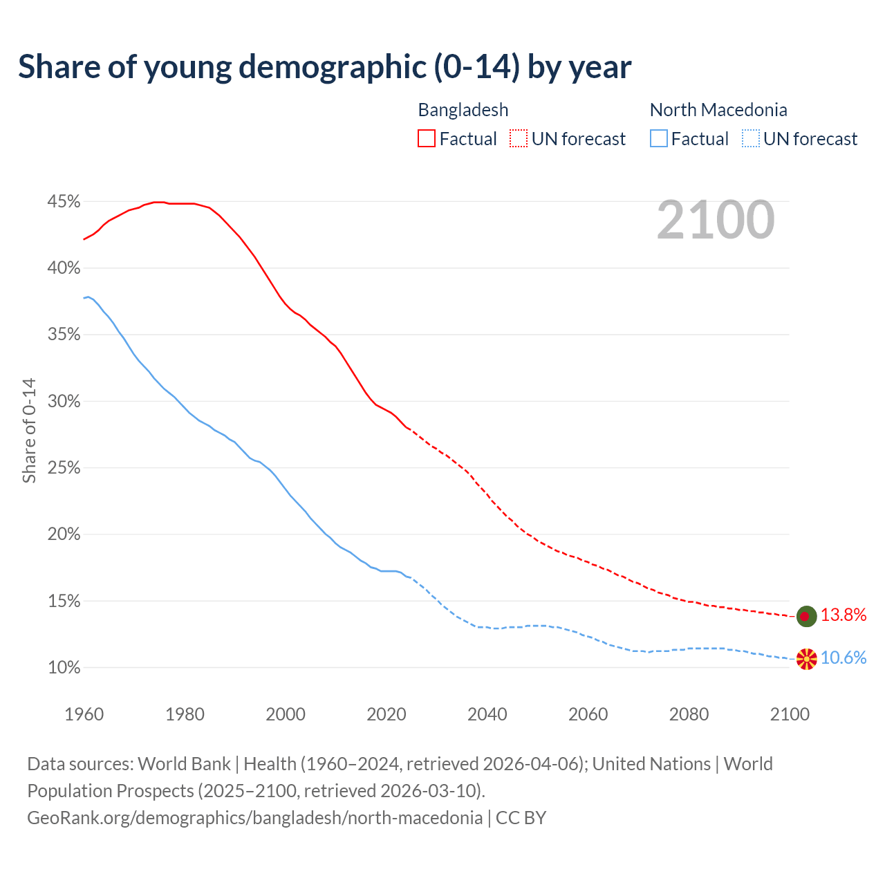 - The share of young demographic (0-15 years old) in Bangladesh is 28% vs 16.8% in North Macedonia.