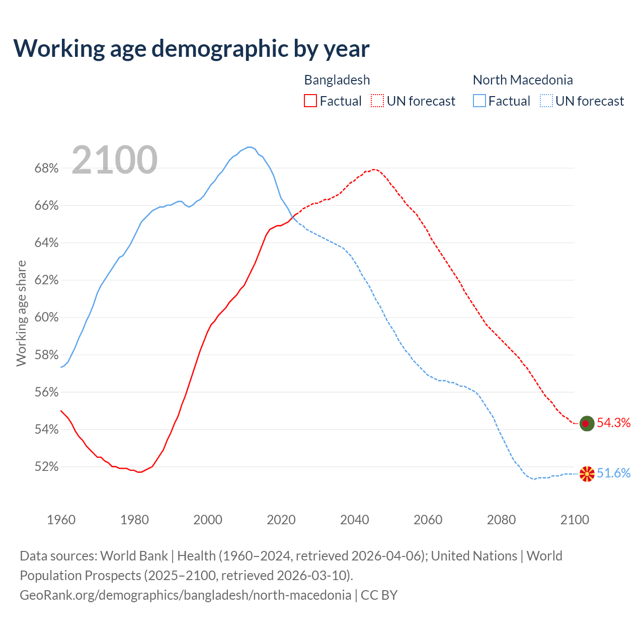 Median age Bangladesh vs North Macedonia, 1960-2100