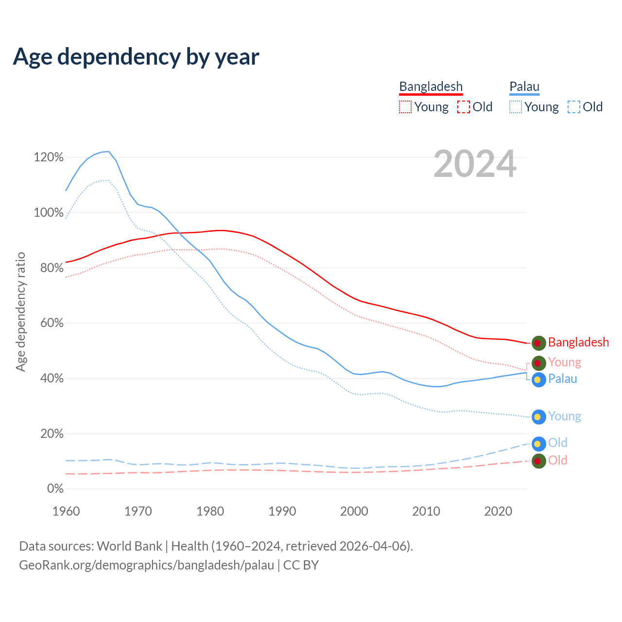 - Bangladesh is ranked 124/196 by median age (oldest to youngest) vs 53/196 for Palau.