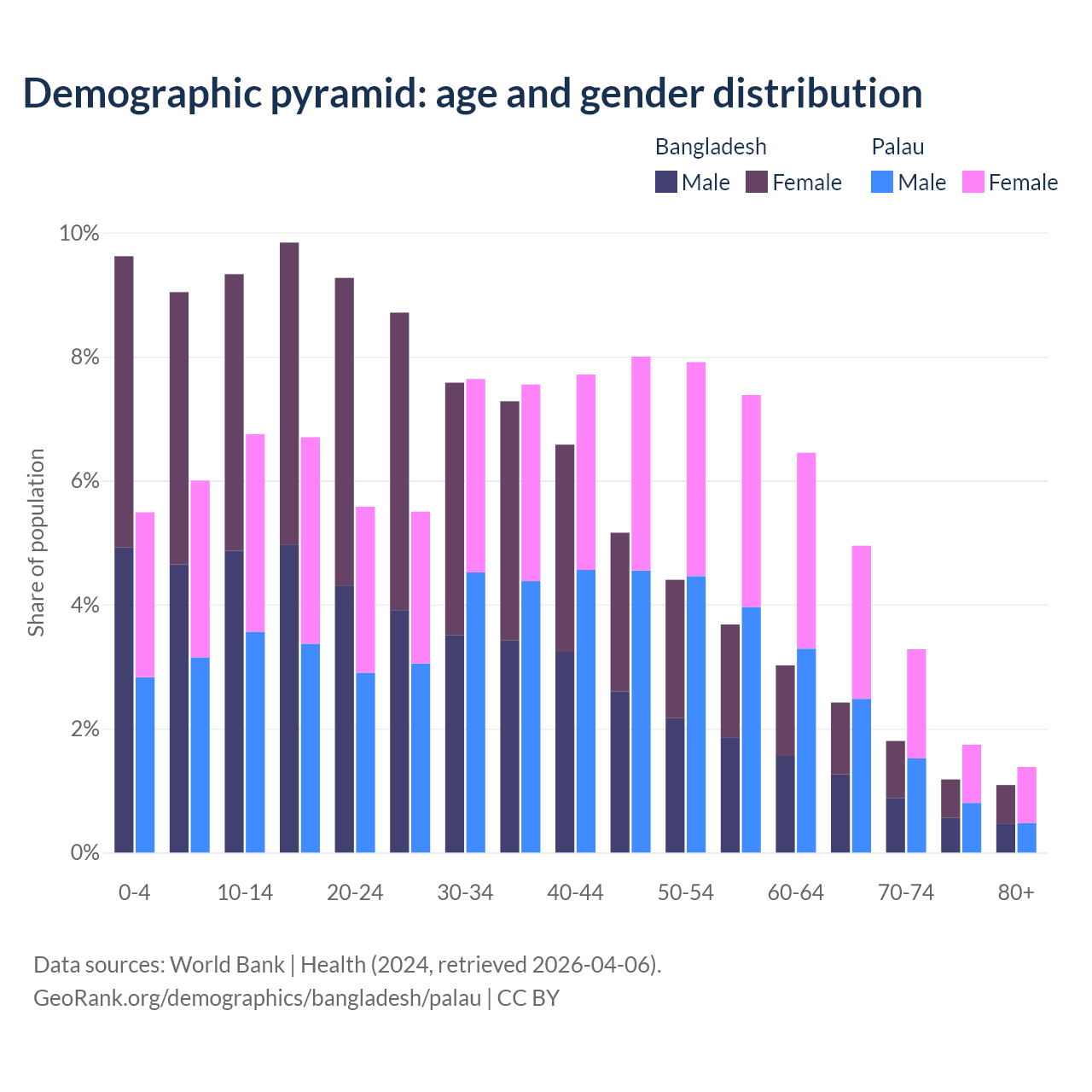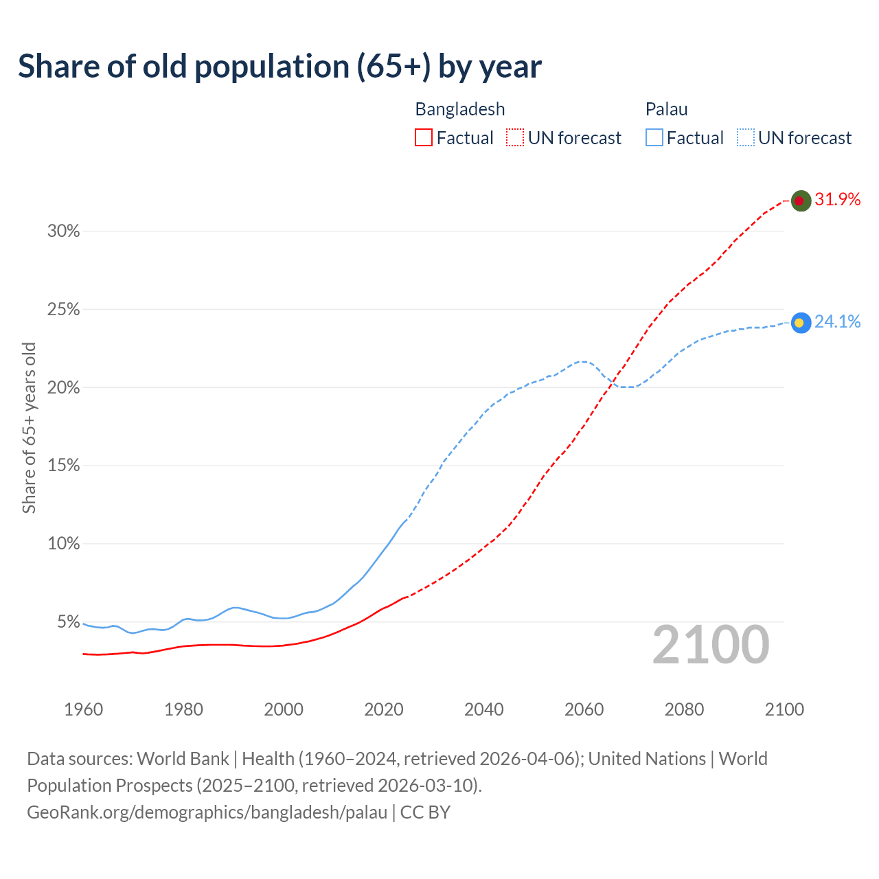 The share of older people aged 65 and over is 6.5% in Bangladesh and 11.3% in Palau. Life expectancy in Bangladesh compared to Palau .