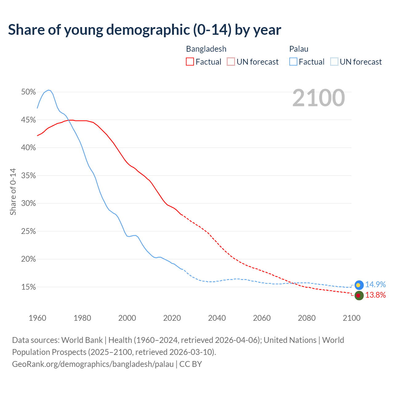 - The share of young demographic (0-15 years old) in Bangladesh is 28% vs 18.2% in Palau.