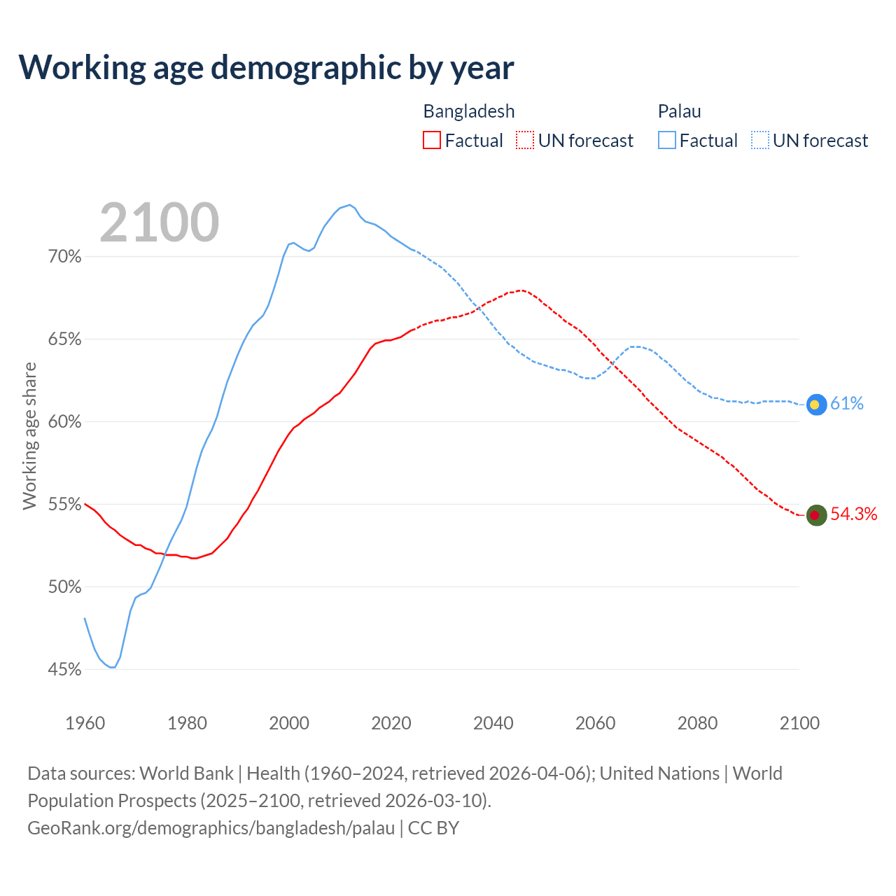 - Bangladesh has 117M working age adults (aged 15-64) vs 12.4K in Palau.
