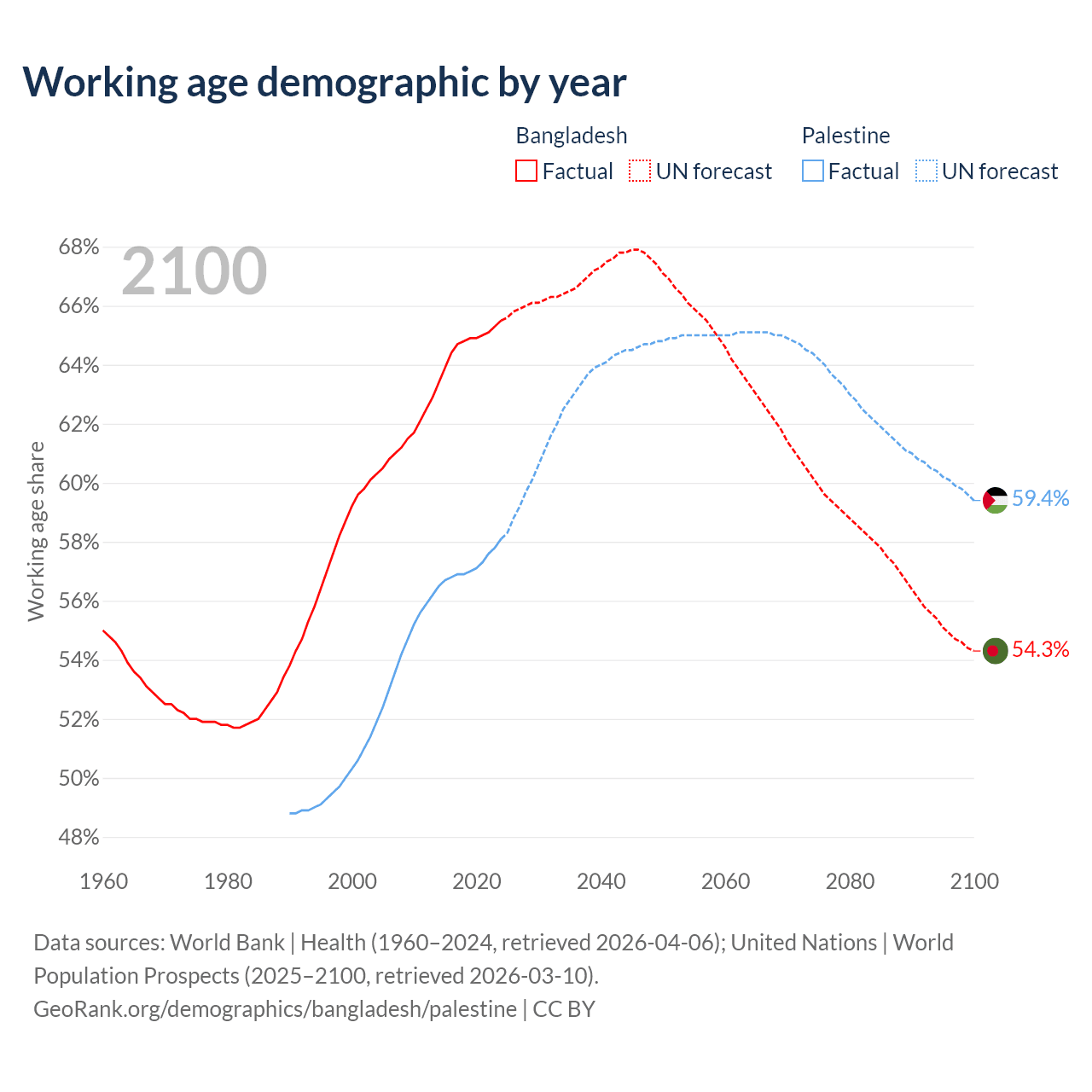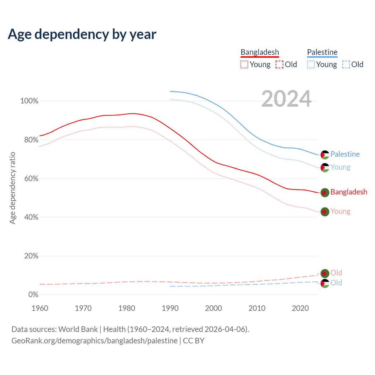 - Bangladesh is ranked 124/196 by median age (oldest to youngest) vs 157/196 for Palestine.
