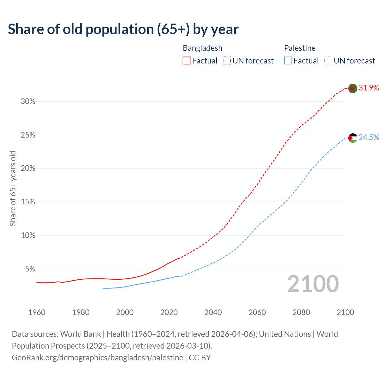 The share of older people aged 65 and over is 6.5% in Bangladesh and 3.84% in Palestine. Life expectancy in Bangladesh compared to Palestine .