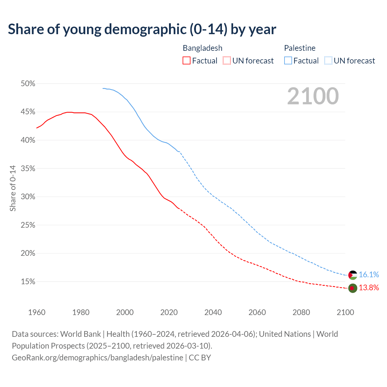 - The share of young demographic (0-15 years old) in Bangladesh is 28% vs 38% in Palestine.
