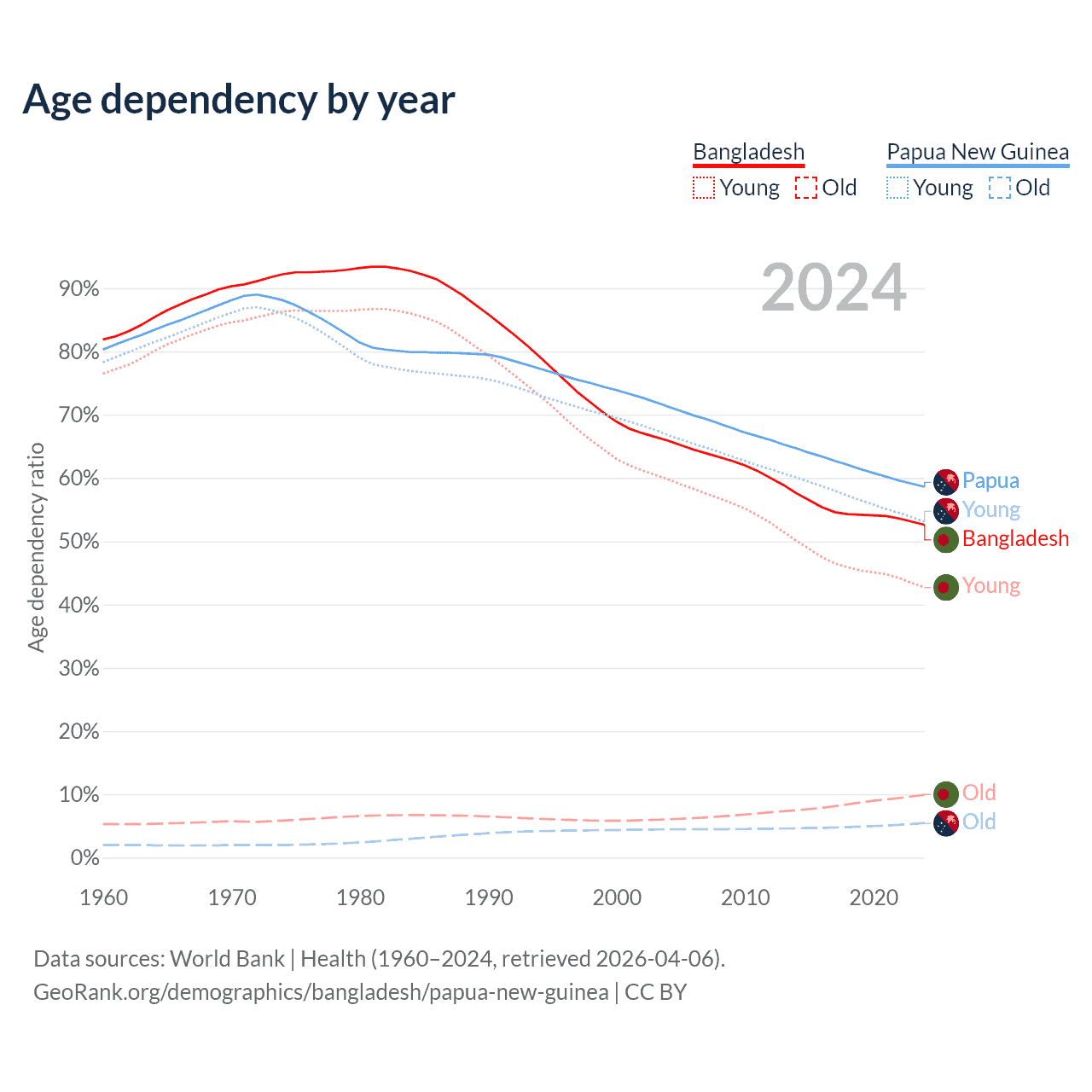 - Bangladesh is ranked 124/196 by median age (oldest to youngest) vs 140/196 for Papua New Guinea.