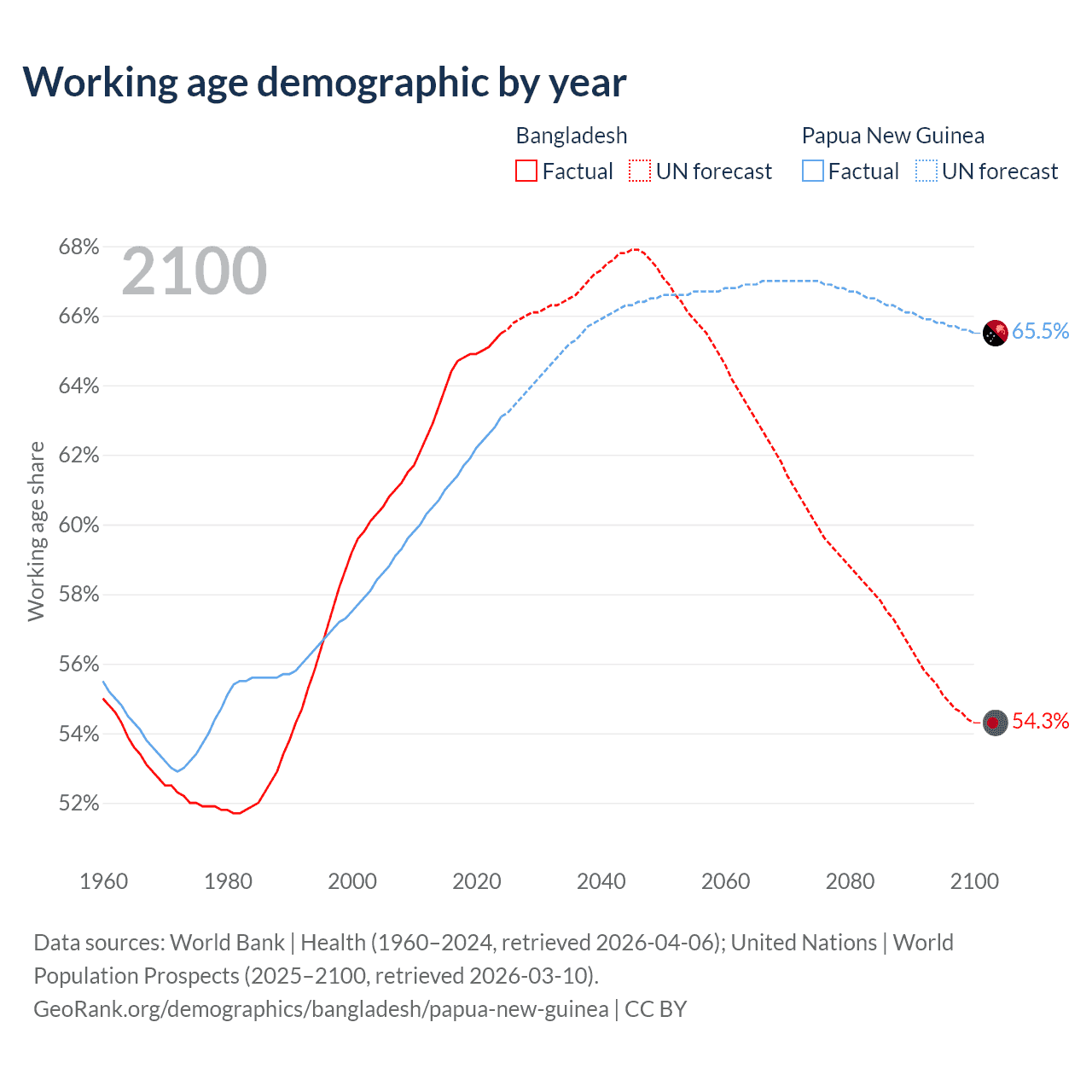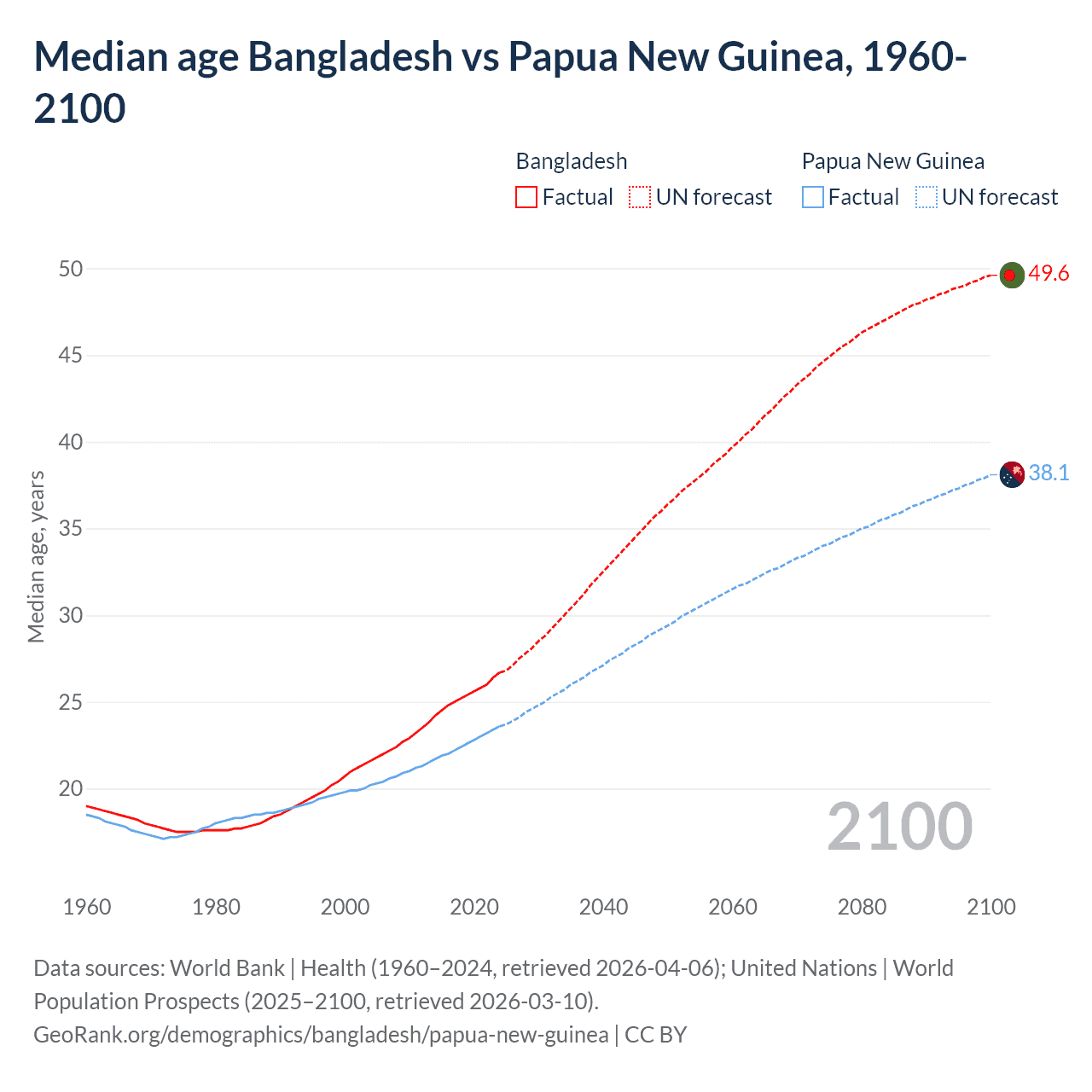 Median age Bangladesh vs Papua New Guinea, 1960-2100