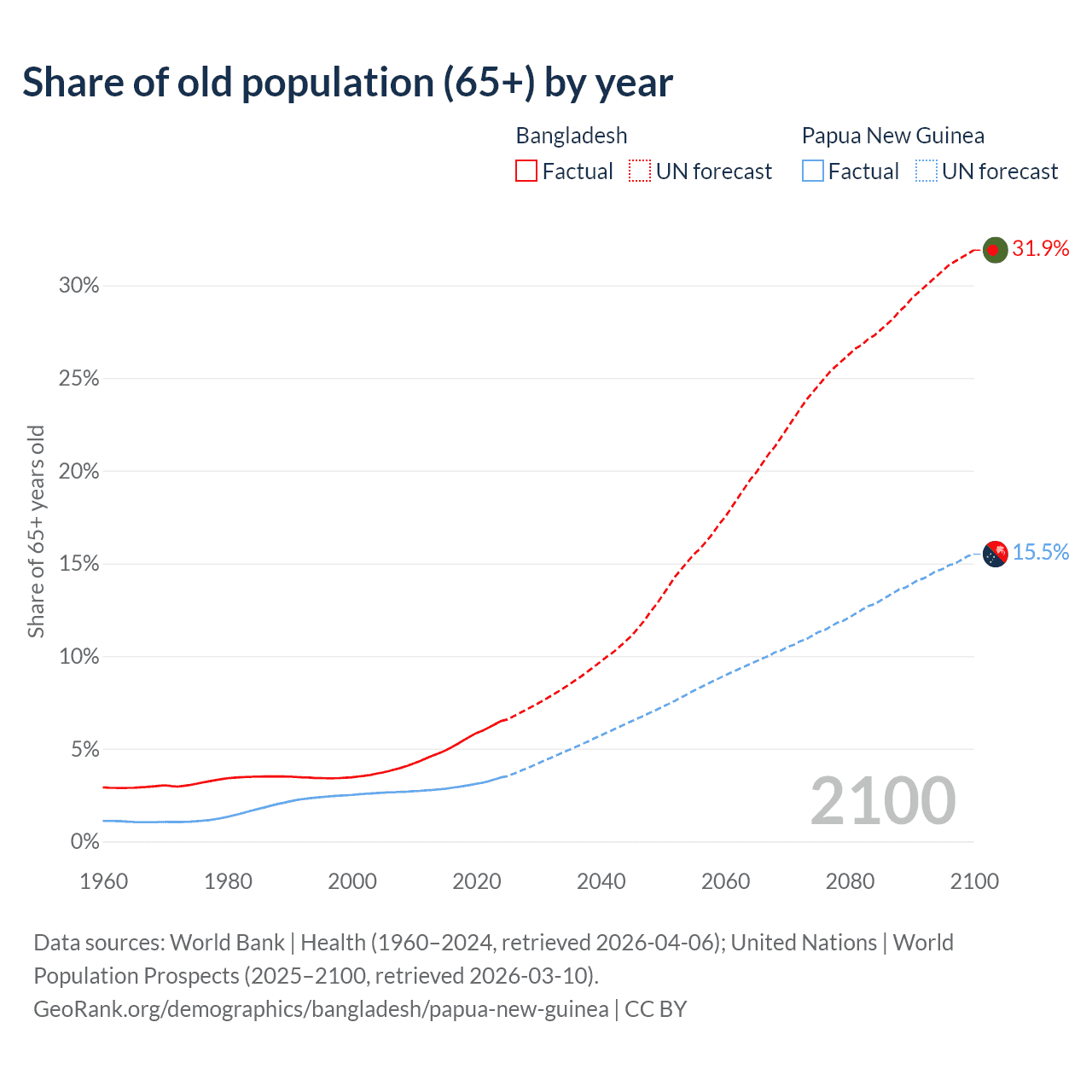 The share of older people aged 65 and over is 6.5% in Bangladesh and 3.46% in Papua New Guinea. Life expectancy in Bangladesh compared to Papua New Guinea .
