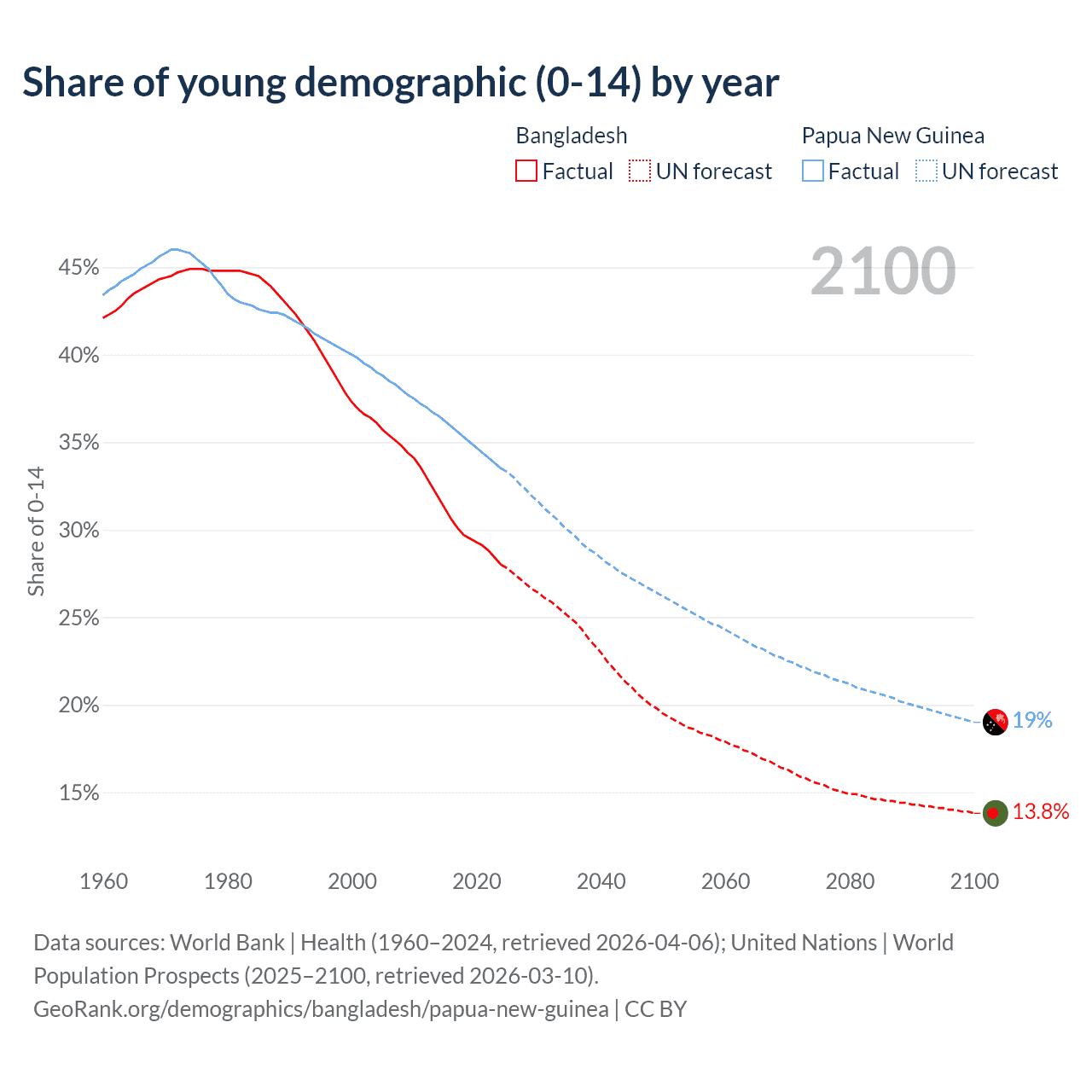 - The share of young demographic (0-15 years old) in Bangladesh is 28% vs 33.5% in Papua New Guinea.
