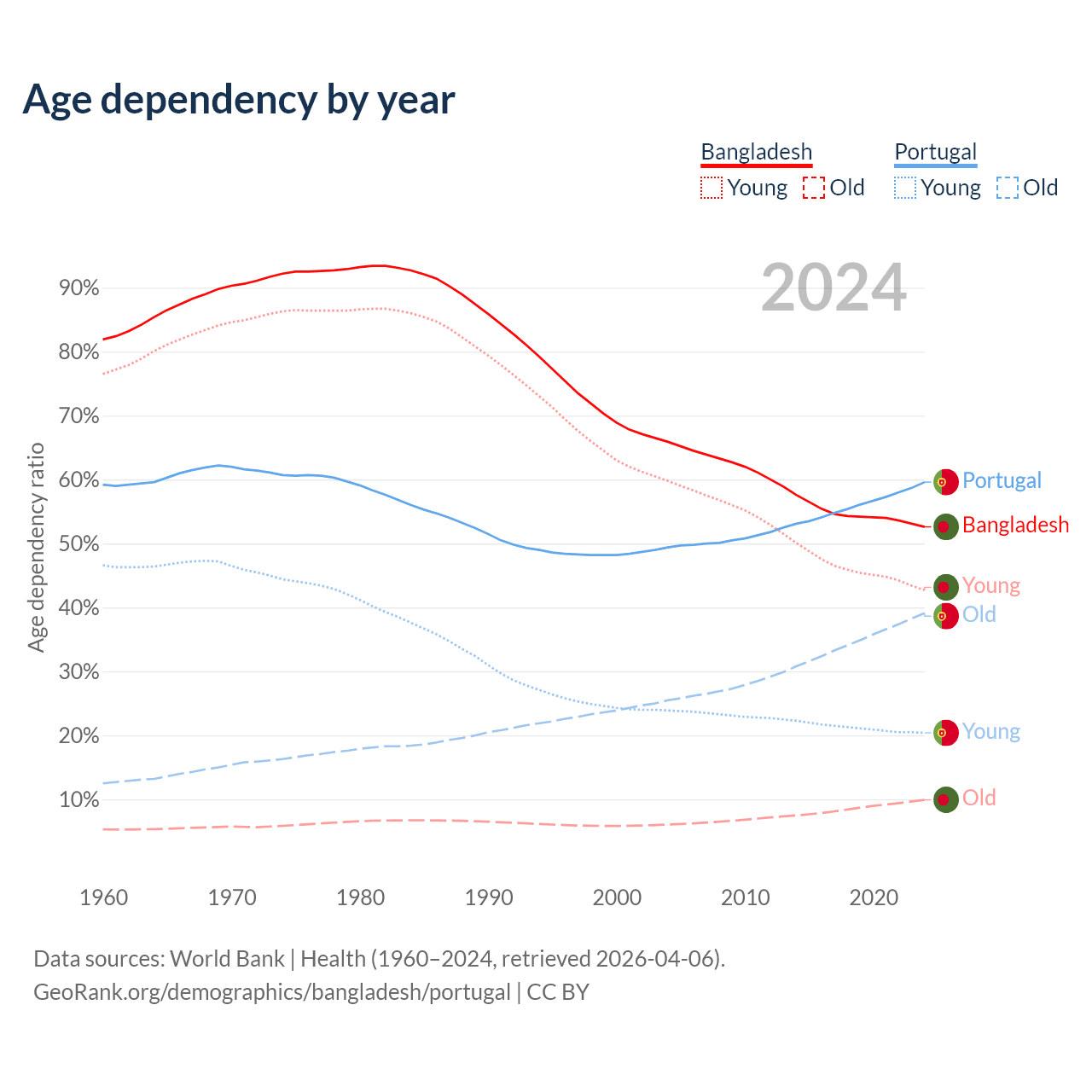 - Bangladesh is ranked 124/196 by median age (oldest to youngest) vs 5/196 for Portugal.