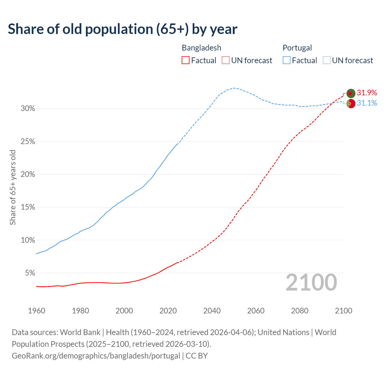 The share of older people aged 65 and over is 6.5% in Bangladesh and 24.5% in Portugal. Life expectancy in Bangladesh compared to Portugal .