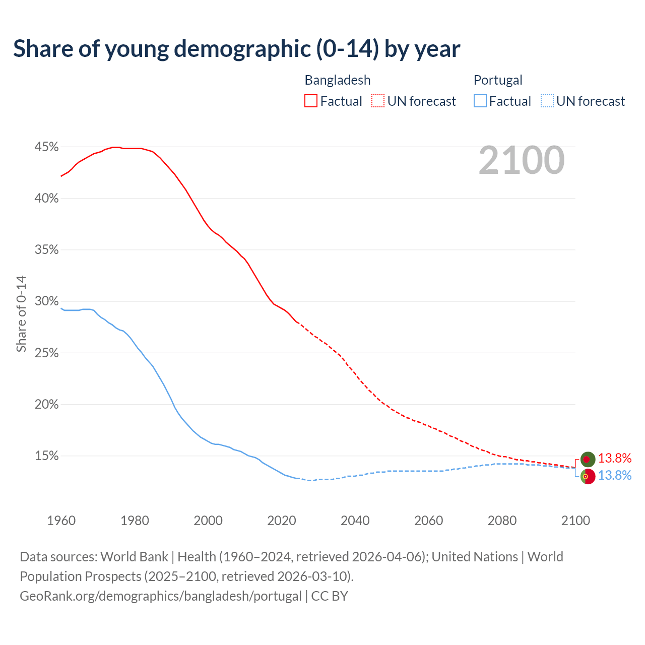 - The share of young demographic (0-15 years old) in Bangladesh is 28% vs 12.8% in Portugal.