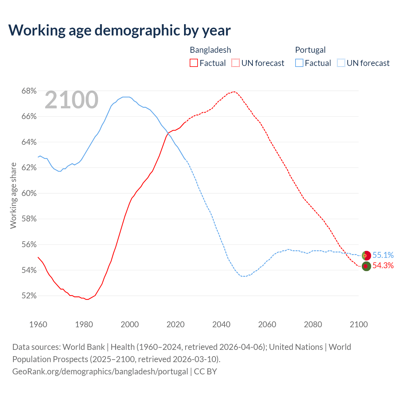 - Bangladesh has 117M working age adults (aged 15-64) vs 6.68M in Portugal.