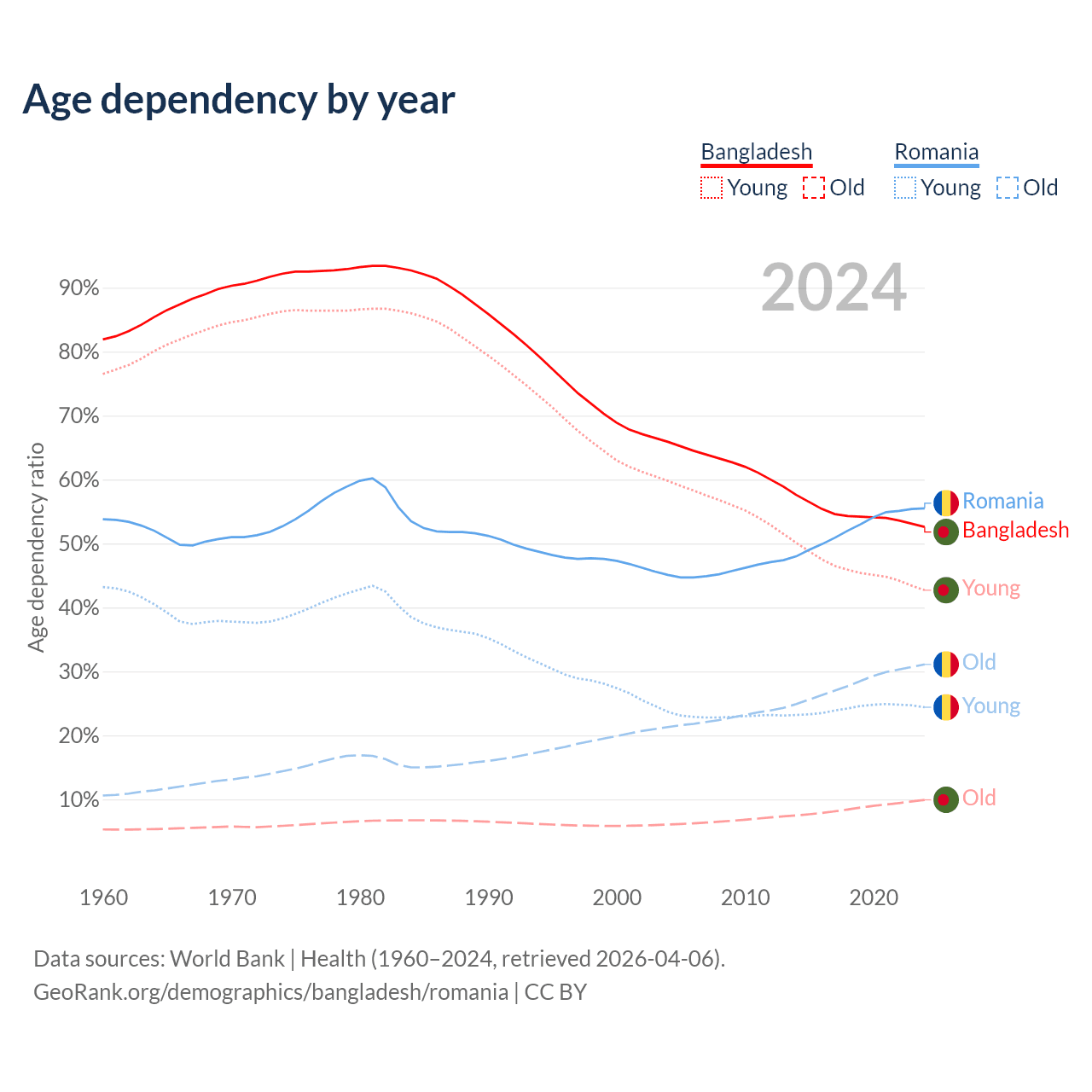 - Bangladesh is ranked 124/196 by median age (oldest to youngest) vs 23/196 for Romania.