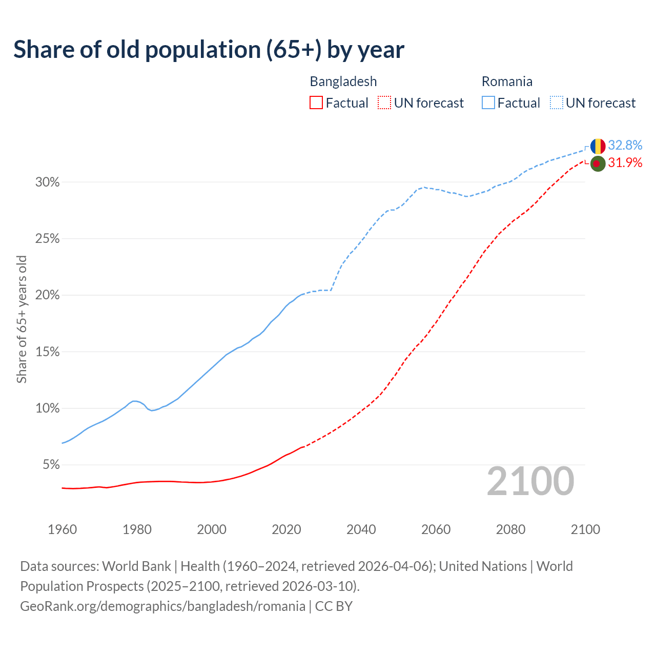 The share of older people aged 65 and over is 6.5% in Bangladesh and 20% in Romania. Life expectancy in Bangladesh compared to Romania .